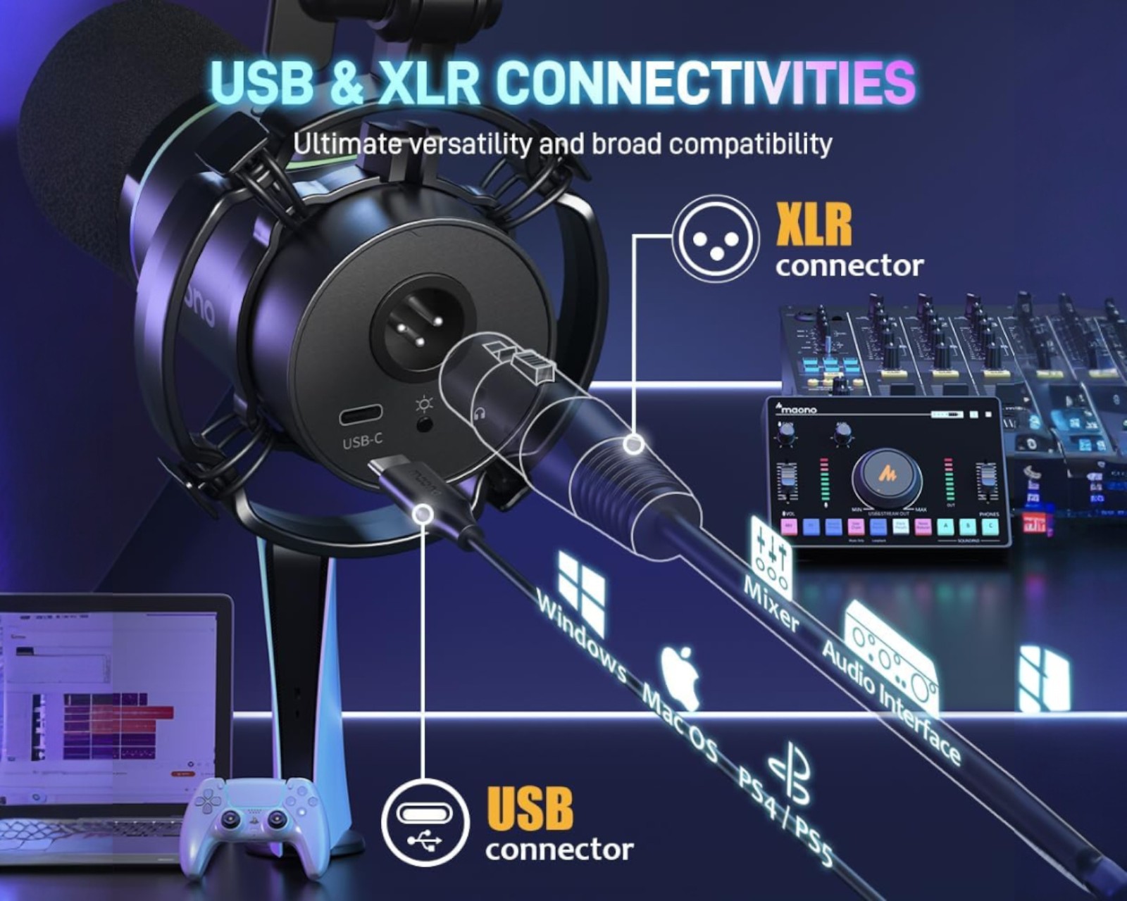 PD200x är en dynamisk mikrofon från Maono som erbjuder både XLR- och USB-C-anslutningar, vilket ger användaren flexibilitet för inspelning, streaming och podcasting. Mikrofonen är designad för att nå professionell ljudkvalitet, med en särskilt utvecklad mikrofonkapsel som säkerställer klar och balanserad ljudåtergivning. Den är lämplig för både nybörjare och mer avancerade användare.Enheten är konstruerad med en robust metallkropp som garanterar hållbarhet och lång livslängd. Den innovativa mikrofonkapseln är utformad för att fånga ljudet med hög precision, vilket minimerar bakgrundsbrus. Den stilrena RGB-belysningen erbjuder val mellan åtta färger och ett färgskiftande läge som kan stängas av helt. Mikrofonsystemet inkluderar Maono Link-programvara som tillhandahåller detaljerade ljudjusteringar såsom equalizer och limiter, vilket ger användaren full kontroll över ljudets egenskaper.
