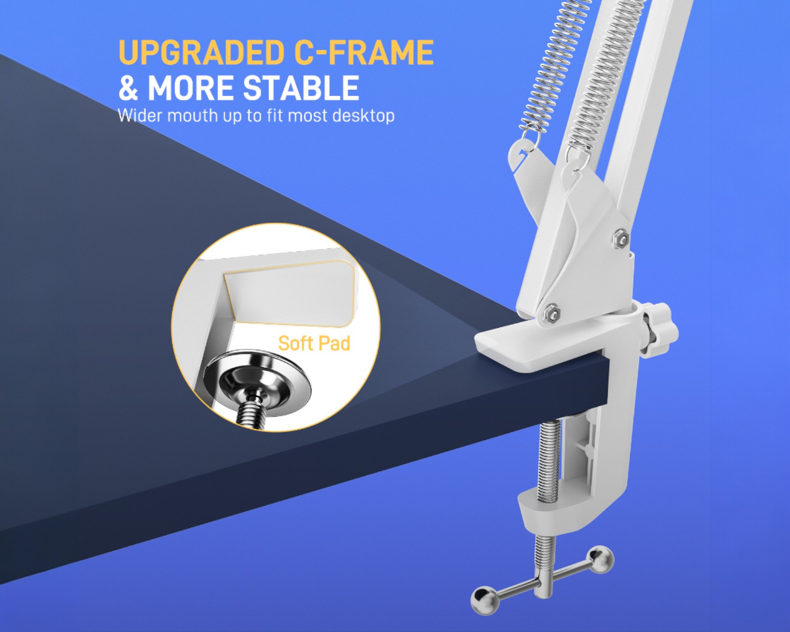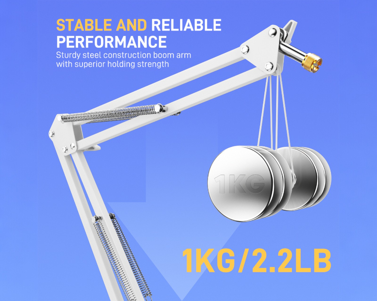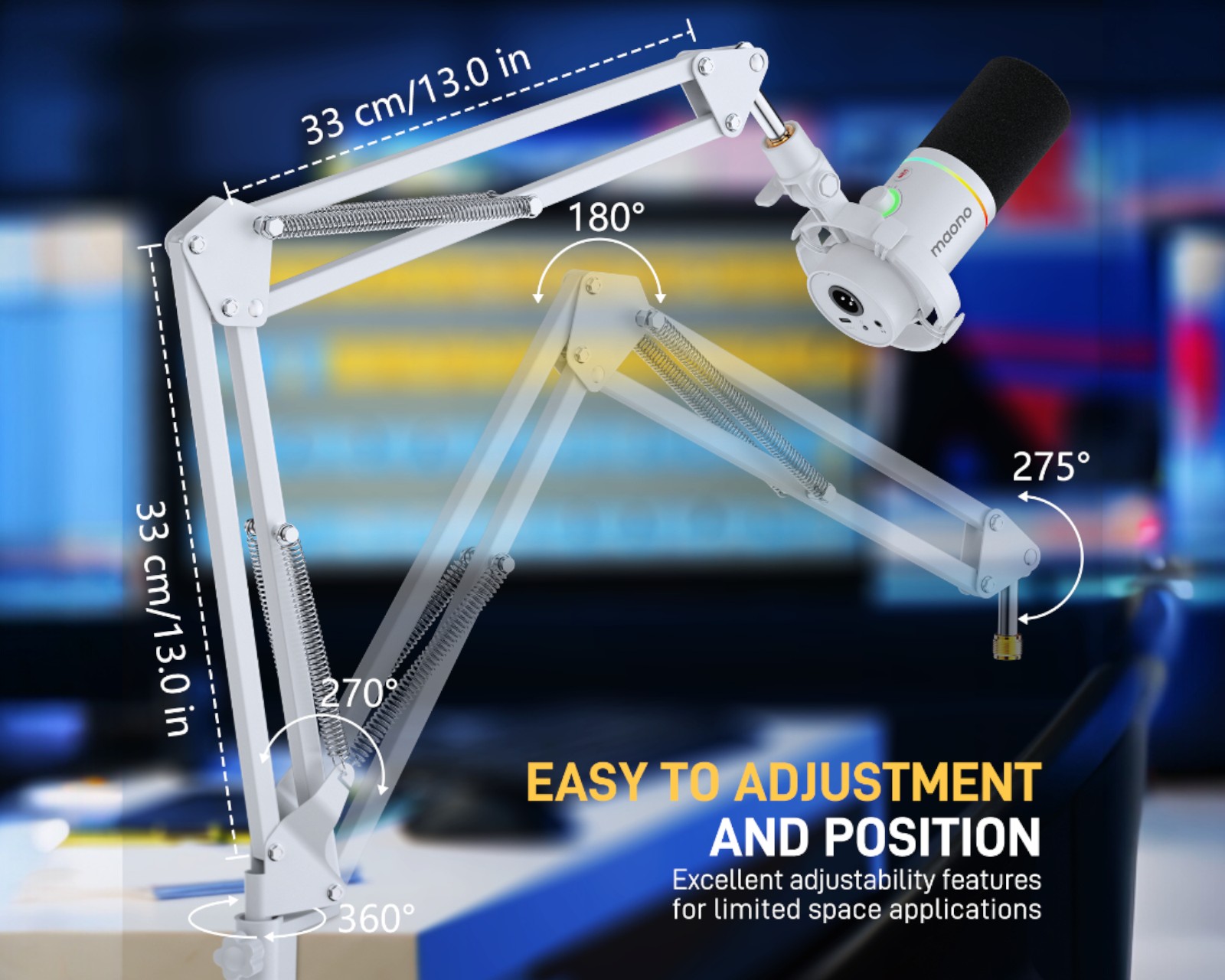 Mikrofonarm från Maono som erbjuder stabil och pålitlig prestanda. Utrustad med en avancerad konstruktion av stål och precisionsdesignade fjädrar kan den stödja mikrofoner som väger upp till 1 kg. Dess specifikationer inkluderar en 5/8" till 3/8" skruvadapter och en standard mikrofonklämma som passar de flesta mikrofoner. Denna produkt är särskilt lämplig för podcasters, streamers och gamers.Boom Armens design gör det enkelt att justera och positionera mikrofonen för optimal inspelningskomfort. Genom att enkelt lossa knoppen kan vinkeln och höjden justeras, vilket möjliggör tyst och smidig placering. Den är utformad så att användaren kan förflytta mikrofonen när den behövs och sedan skjuta bort den för att få en ren arbetsyta vid inspelning.