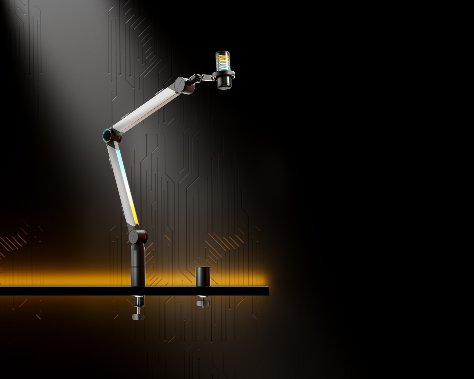 Aluminium Dynamisk RGB Mikrofonarm är en premium mikrofonarm från MaxMount, utformad för att förbättra både professionella gaming- och streamingmiljöer. Den integrerade volymkontrollen ger användaren möjlighet att enkelt justera systemvolymen, medan det unika designkonceptet med en oändlig spegel vid leden och RGB-strips längs den nedre armen skapar en iögonfallande visuell effekt. Mikrofonarmen är byggd för hållbarhet och stabilitet, vilket kombinerar pålitlig prestanda med en modern estetik för att erbjuda en högvärdig lösning för innehållsskapande och liveproduktion.Mikrofonarmen är tillverkad av kvalitativa material som aluminium, plast och stål, vilket ger en hållbar konstruktion. Med sin maximala viktkapacitet på 1.5 kg och en justerbar höjd på upp till 1028 mm kan användaren enkelt anpassa armens position för att uppnå optimal komfort under livestreaming. Den dynamiska RGB-belysningen skapar levande färgeffekter som kan anpassas efter stämningen. Kabelhanteringen håller allt organiserat och fritt från oreda, och tack vare 3/8” och 5/8” adaptrar är mikrofonarmen kompatibel med de flesta standardmikrofoner.