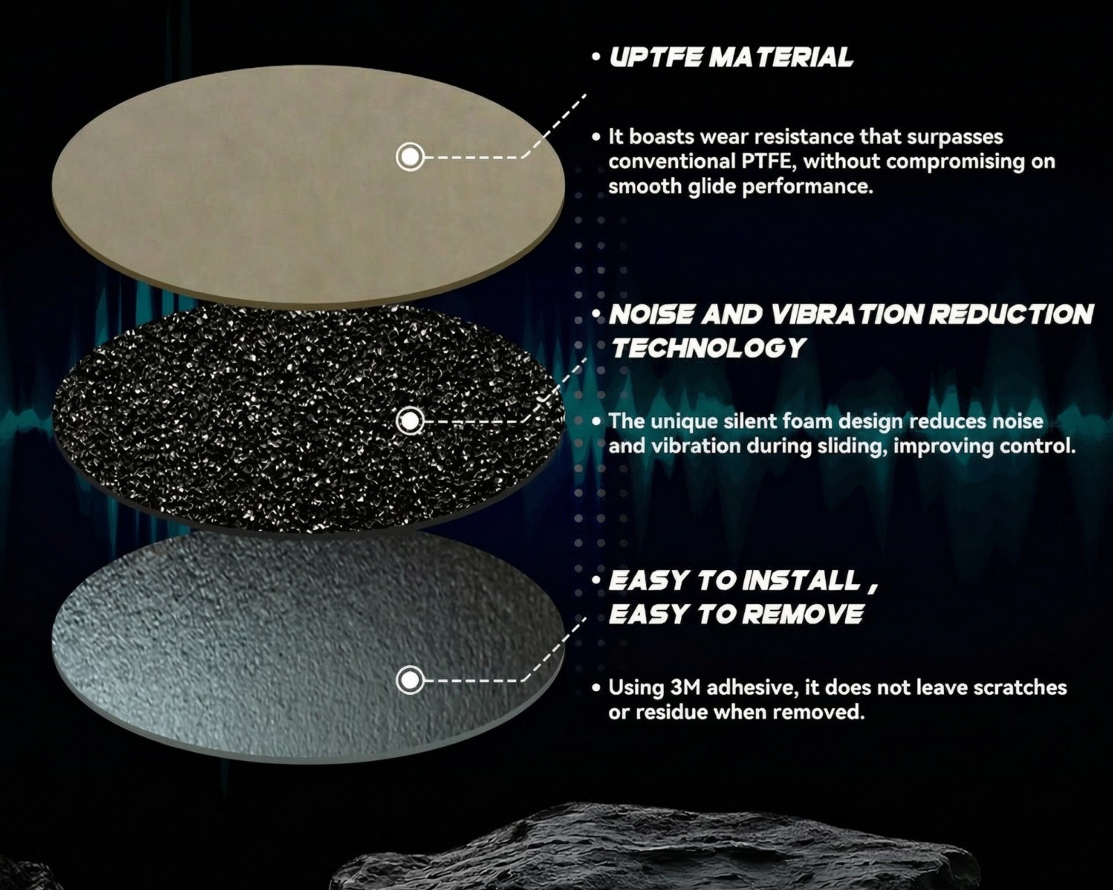 De är tillverkade av UHMW-PE-material som garanterar hög hållbarhet och långvarig prestanda. Tack vare en super rund edgepolishing-process har skates en slät yta som minimerar friktionen, vilket ger en jämn och snabb rörelse. Den inkluderade 3M-teknologin gör installation och borttagning enkel, utan att lämna kvar klisterrester. Dessutom reducerar den tysta skumdesignen både ljud och vibrationer, vilket ger förbättrad kontroll och stabilitet under spel.