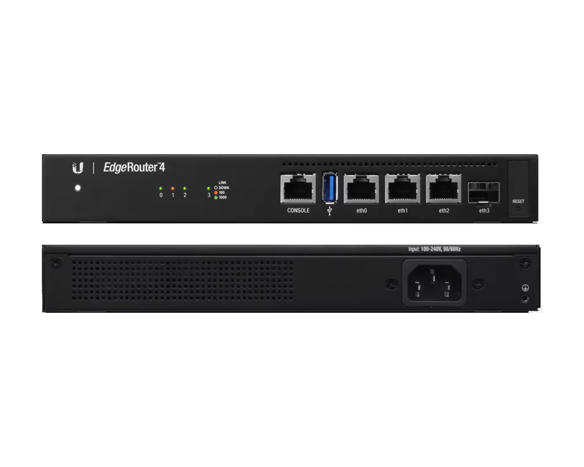 EdgeRouter ER-4 har tre stycken Gigabitanslutningar och en SFP-port för fiberanslutning. Routern är kapabel upp till 3.4 miljoner paket per sekund och har en maximal bandbredd på 4 Gigabit/sekund. ER-4 har Ubiquitis egna EdgeOS-operativsystem med inutivit webbgränssnitt men även stöd för ett Command Line Interface (CLI).