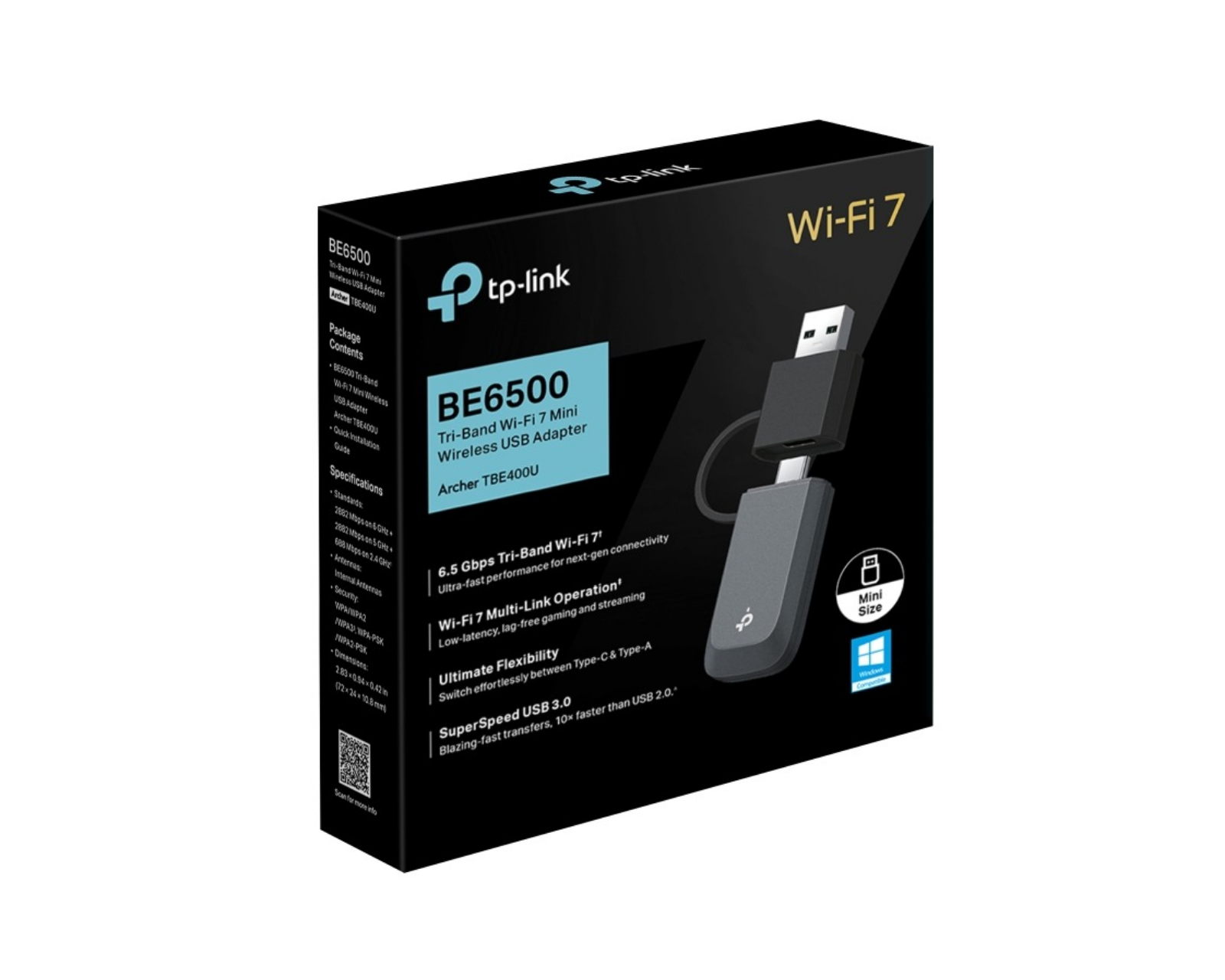 Archer TBE400U BE6500 Tri-Band Wi-Fi 7 Mini är en trådlös USB-adapter från TP-Link som kombinerar hög prestanda med avancerad teknologi. Den är designad för att erbjuda en smidig och kraftfull trådlös anslutning med hastigheter upp till 2882 Mbps på både 6 GHz och 5 GHz band medan 2.4 GHz-bandet levererar 688 Mbps. Adapterns stöd för Wi-Fi 7 tillsammans med Multi-Link Operation säkerställer minskad latens och en stabil upplevelse för gaming och streaming.Archer TBE400U är utformad med både USB-C och USB-A portar, vilket ger användare flexibilitet att koppla in en rad olika enheter utan att behöva extra adaptrar. Med SuperSpeed USB 3.0 får användare upp till 10 gånger snabbare överföringshastigheter jämfört med USB 2.0, vilket gör den perfekt för stora filer och snabbare anslutningar. Den senaste WPA3-säkerheten erbjuder ytterligare skydd mot obehörig åtkomst och säkerställer att din data är skyddad. Installationen är enkel och kräver ingen CD, vilket gör att den är plug-and-play-kompatibel med Windows 10 och 11.
