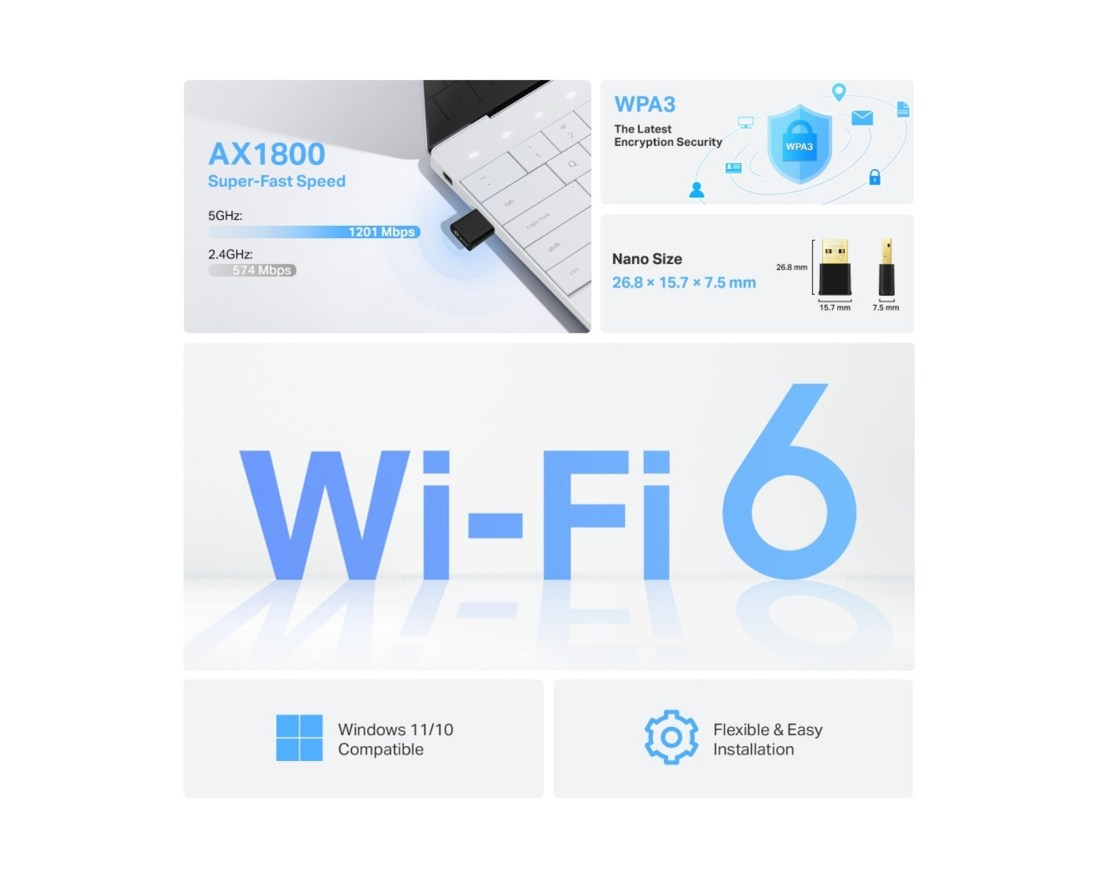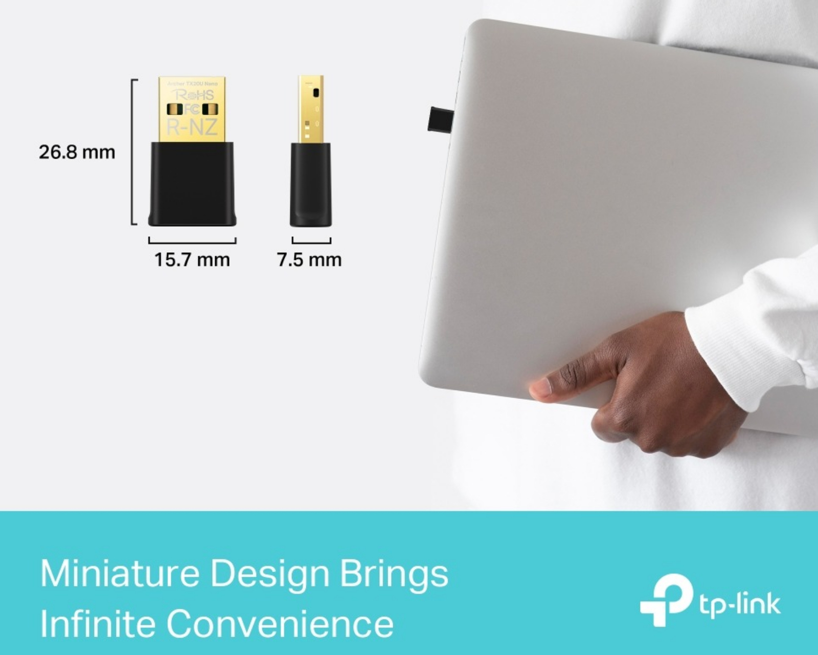 Archer TX20U Nano är en trådlös USB-adapter från TP-Link som erbjuder snabb och pålitlig anslutning via Wi-Fi 6. Denna kompakta adapter ger hastigheter på upp till 1201 Mbps på 5 GHz-bandet och 574 Mbps på 2.4 GHz-bandet, vilket gör den idealisk för gamers och nätverksentusiaster som kräver hög prestanda. Med sina dual band-funktioner möjliggör den flexibel anslutning utan störningar, så att användarna kan njuta av en smidig onlineupplevelse.Adapterns avancerade teknik, inklusive OFDMA och MU-MIMO, säkerställer lägre latens och effektivare dataöverföring till flera enheter samtidigt. Det kompakta måttet på 26.8 x 15.7 x 7.5 mm gör den lätt att transportera och installera; dessutom är drivrutinen förinstallerad, vilket förenklar uppsättningen. Archer TX20U Nano är även kompatibel med Windows 11/10, vilket gör den till en mångsidig lösning för olika användare. Med säkerhetsprotokollet WPA3 får du dessutom förbättrad skydd mot cyberhot.