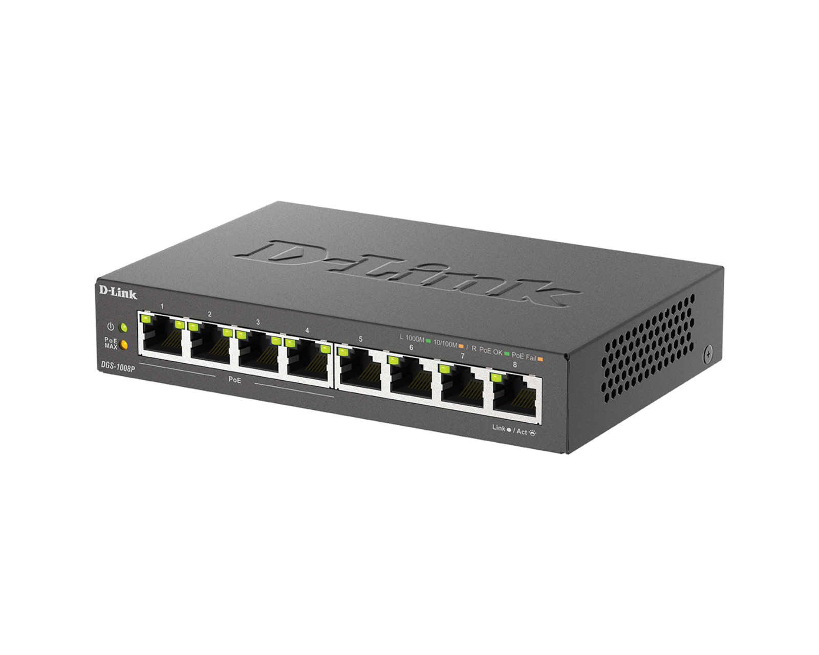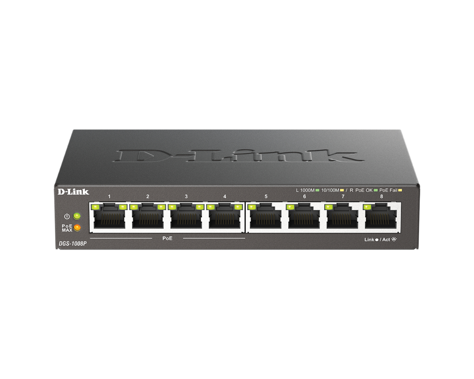 8-Port 10/100/1000 Desktop Switch med 4 PoE-portar är en nätverksswitch från D-Link. Den kan överföra ström till upp till fyra enheter via Power over Ethernet-teknik, vilket förenklar anslutningen av nätverksenheter som trådlösa accesspunkter, IP-kameror och IP-telefoner. Enheten är designad för användare som söker en kostnadseffektiv lösning för att maximera nätverkets prestanda.DES-1008P har åtta porter som stödjer 10/100/1000 Mbps hastigheter, vilket innebär möjlighet för snabb dataöverföring. Byggkvaliteten är hög, med fokus på pålitlighet och hållbarhet, vilket gör den lämplig för hemmabruk och små kontor. Enheten kan enkelt installeras och väggmonteras för att spara skrivbordsytan. Den opererar tyst och är därför lämplig även i ljudkänsliga miljöer. DES-1008P kan även delas upp för fil- och videodelning över nätverket, samt ansluta datorer och skrivare.