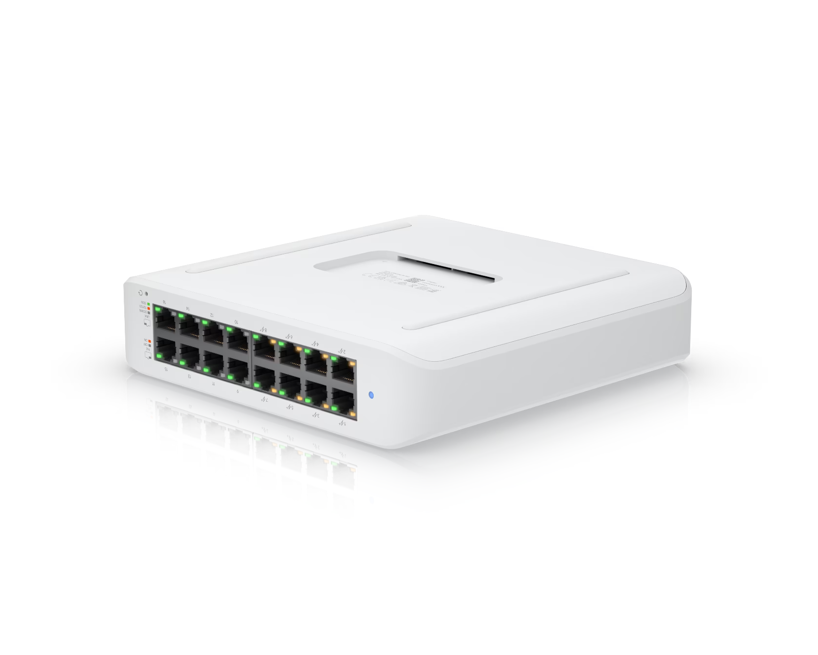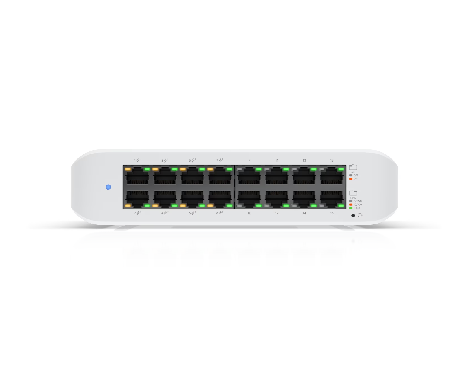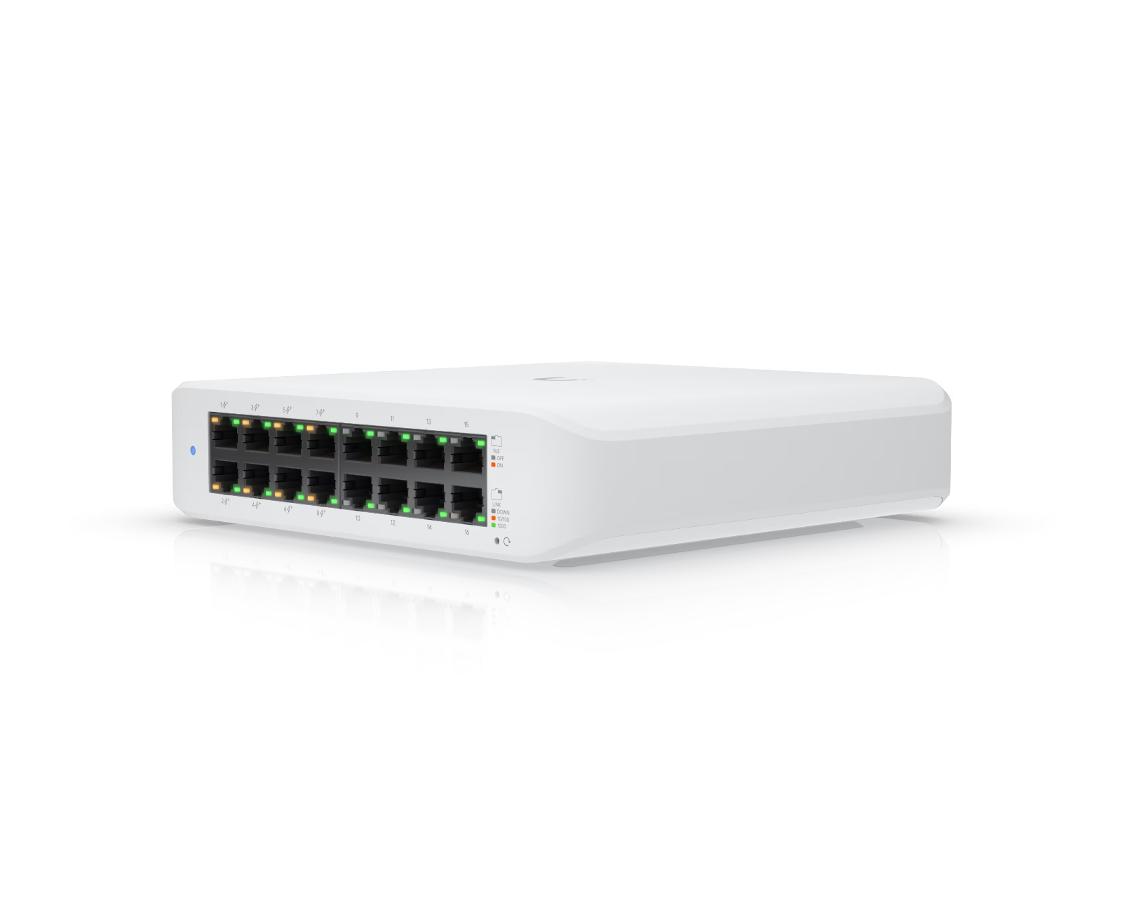 UniFi Switch Lite 16p PoE är en fläktlös 16-portars Layer 2 switch från Ubiquiti, utformad för att hantera både PoE+ och standard RJ45-anslutningar. Enheten erbjuder 8 GbE PoE+ portar samt 8 st 1GbE RJ45-portar, vilket möjliggör strömförsörjning via nätverkskabel. Total PoE-budget är 45 W och den är lämplig för små till medelstora nätverksinstallationer.b