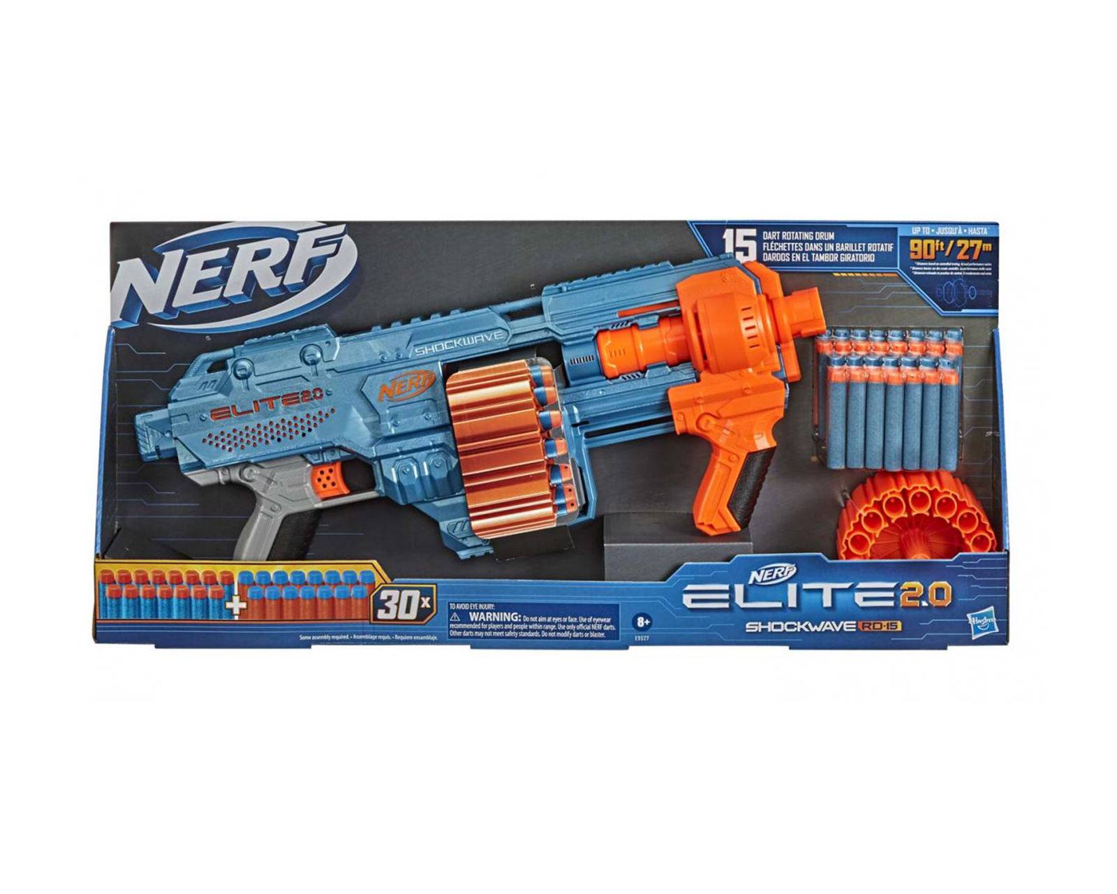 Elite 2.0 Shockwave RD-15 är en blaster från Nerf Gun som erbjuder pump-action och en 15-dart roterande trumma för ökad kapacitet och effektivitet. Den är designad för dem som söker en taktisk och flexibel lösning för Nerf-strider och inkluderar expansionsalternativ för anpassning. Shockwave RD-15 har tre Tactical Rail-skenor som möjliggör montering av ytterligare tillbehör, en fästpunkt för fatförlängning och en axelstöd-fästpunkt.Blasterns konstruktion är robust och fokuserad på användarvänlighet. Genom att dra tillbaka spännreglaget kan en dart avfyras, och om avtryckaren hålls ned kan alla 15 pilar skjutas kontinuerligt genom att spännreglaget flyttas i en upprepande rörelse. Enheten skjuter dart upp till 27 meter, vilket ger spelaren en fördel i stridsscenarier. Shockwave RD-15 levereras med 30 officiella Nerf-dart, där 15 är för det integrerade magasinet och 15 som reserv.