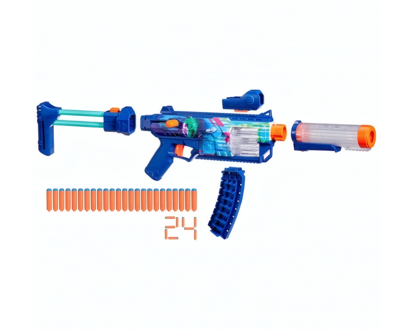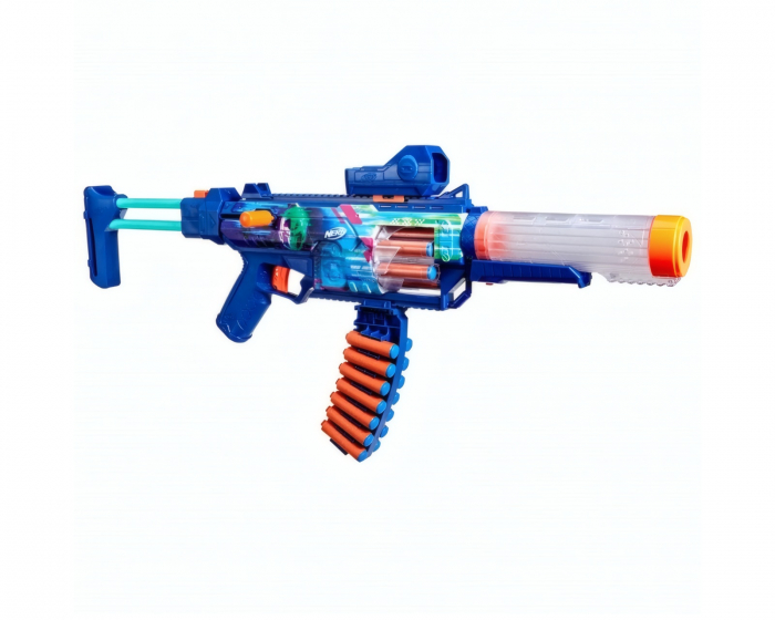 Nerf LoadOut Cyberlight Ghost är en bultmekanismblaster från Nerf som erbjuder anpassningsmöjligheter med över 1000 kombinationer av utbytbara delar. Denna blaster är designad för gamers som söker en dynamisk och trygg upplevelse i sina blasterstrider. Det LED-baserade ljusssystemet lyser upp pipan och cylindern för att ge en unik visuell effekt under användning.Cyberlight Ghost-blastern är konstruerad med en roterande cylinder som rymmer 6 NERF N1-pilar, vilket bidrar till en snabb och effektiv avfyrning. Den har en kolv och pipa samt ett förvaringsfack för pilar, vilket underlättar hantering och förvaring. Slutstycket är monterbart på båda sidor av blastern, vilket möjliggör användning av både höger- och vänsterhänta gamers. NERF N1-pilar är specifikt designade för att ge hög precision, hastighet och räckvidd och är endast kompatibla med NERF N1-pilblaster.