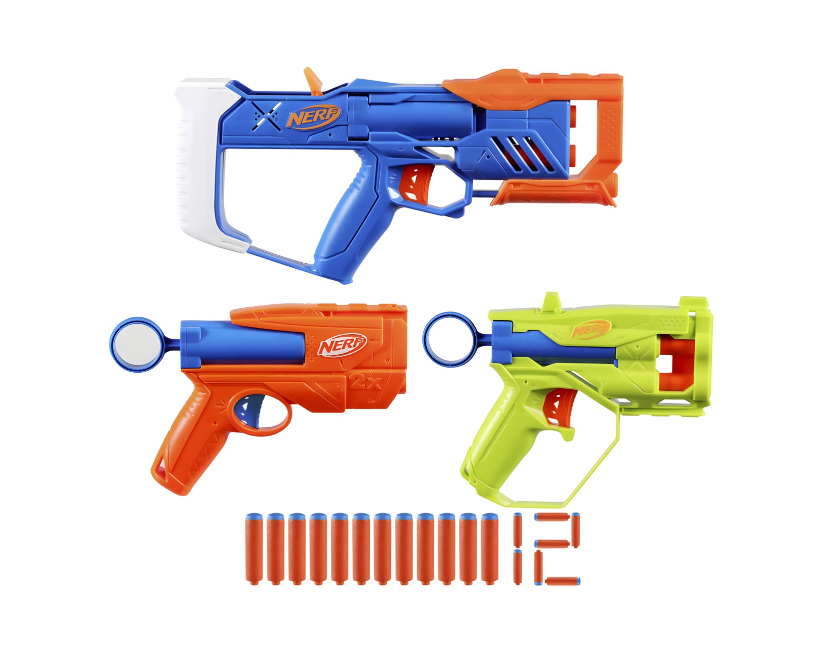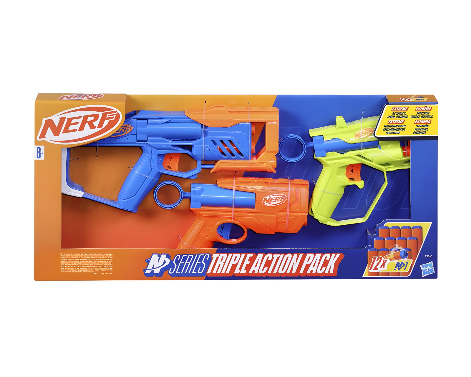 N-Series Blaster - Triple Action Pack är ett set från Nerf som innehåller tre unika blasters. Varje blaster har en kapacitet för 2 dartpilar och levereras med 12 N1-skumdartpilar. Paketet möjliggör såväl inomhus- som utomhusspel.Blasterna är konstruerade för enkel användning med ett pull-back-priming-system som gör det möjligt för användaren att avfyra dartpilar med precision. I förpackningen ingående N1-skumdartpilar är kända för sin hastighet och noggrannhet, vilket ytterligare förbättrar spelupplevelsen. Notera att dessa blasters endast är kompatibla med Nerf N Series N1-dartpilar och det rekommenderas att använda skyddsglasögon för säkerhet under spel.