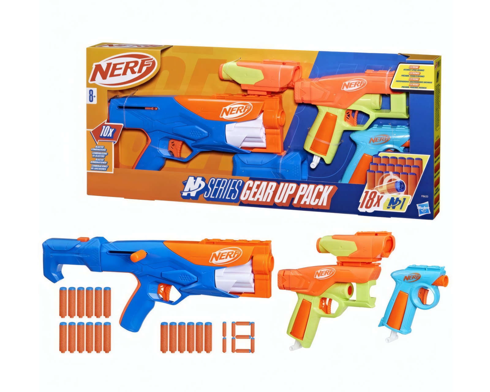 N-Series Gear Up Paket är ett spelutrustningspaket från Nerf, som innehåller tre olika blasters och två tillbehör. Paketet erbjuder möjlighet att skapa upp till tio unika blasterstilar. Uppsättningen inkluderar 18 N1-skumdartpilar och är avsedd för både inomhus- och utomhusspelet. Blastrar har en avfyrningsmekanism med enkel avfyrning, samt en bultmekanism för snabb skottleverans.Blastrarna i N-Series Gear Up Paket har byggts för att säkerställa noggrant och optimerat skott. Flex- och Dealer-blastrarna använder ett neddragbart tändsystem, medan Wielder-blastern har en bultmekanism som kan avfyra upp till fyra pilar följd. Det medföljande skaftet är designat för att fästa på två av blastrarna, vilket ökar stabiliteten och kontrollen under spel. Siktet kan användas med alla tre blastrarna, vilket förbättrar precisionen. Enligt tillverkarens anvisningar är enbart Nerf N Series N1-skumdartpilar kompatibla med dessa blaster.