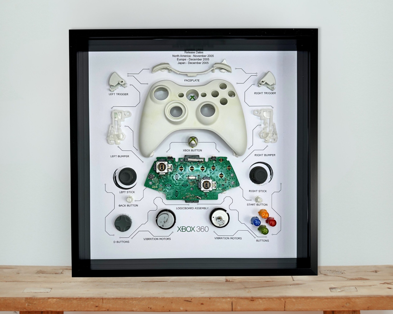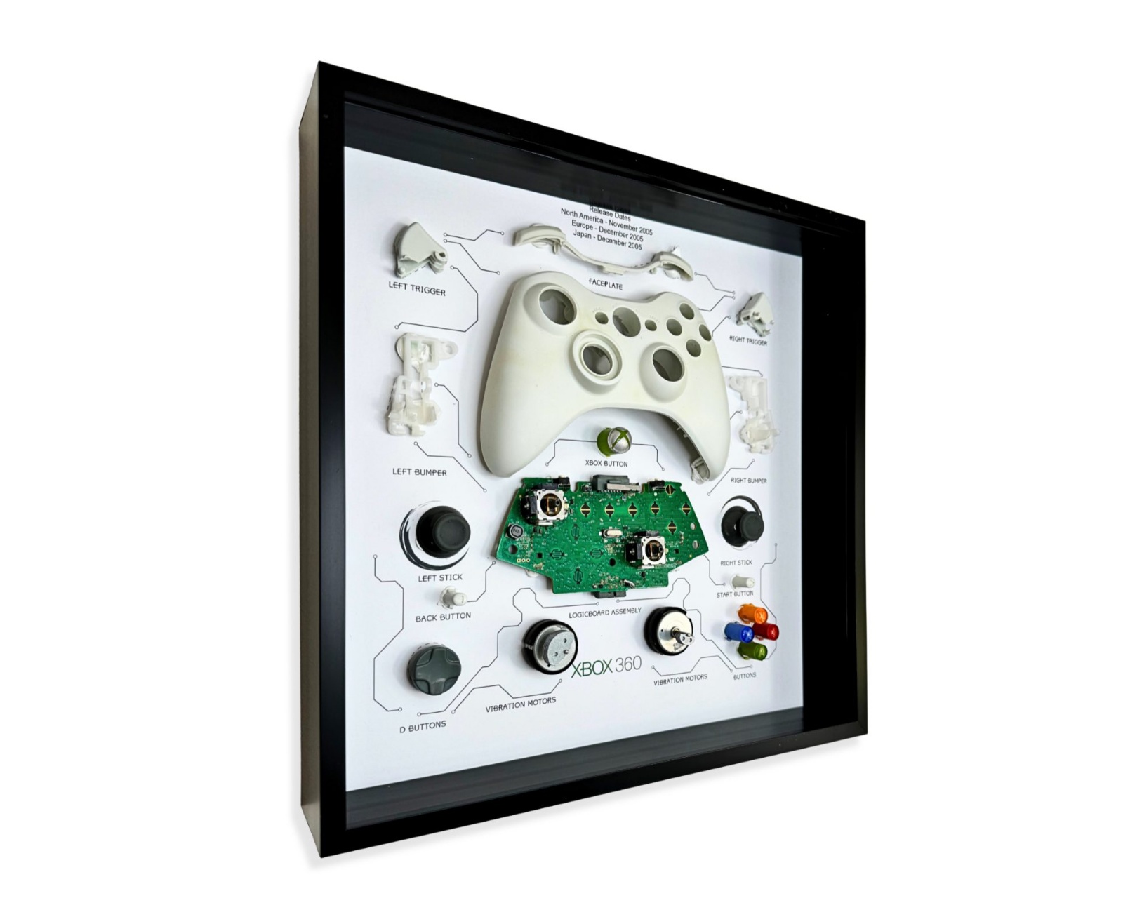Retro Art Microsoft Xbox 360 Trådlös Kontroller Display är en produkt från GRC som fungerar som en visuell presentation av den trådlösa Xbox 360-kontrollen. Den är handgjord med autentiska originaldelar från Xbox 360, vilket ger en unik och retroinspirerad design.Varje del är noggrant placerad i en harmonisk layout och kommer med en informativ etikett som beskriver varje komponents ursprung och relationsdatum. För sitt skydd är displayen försedd med ett robust glas och monterad i en metallram.