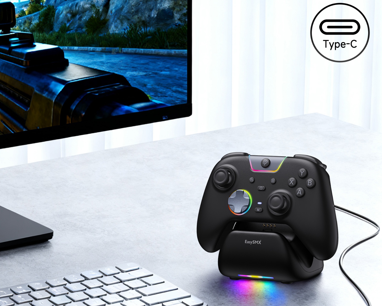 EasySMX X05Pro Laddningsdocka är en dockningslösning riktad till användare av EasySMX X05Pro trådlös kontroll. Produkten erbjuder en säker och formpassande stånd som stabiliserar kontrollern och är enkel att använda med en USB-C anslutning. Dockan är designad för att ge en ren och pålitlig strömkälla utan komplicerade installationer.Dockan är utrustad med ett dedikerat fack för att förvara den trådlösa mottagaren, vilket förhindrar borttappande av viktiga komponenter. Den stabila, halkfria basen med silikonpaddar ser till att dockan står säkert på alla ytor, vilket minimerar risken för att den glider eller välter vid användning. En förhöjd visningsvinkel gör att kontrollen enkelt kan visas på skrivbordet, hyllor eller i spelrum.