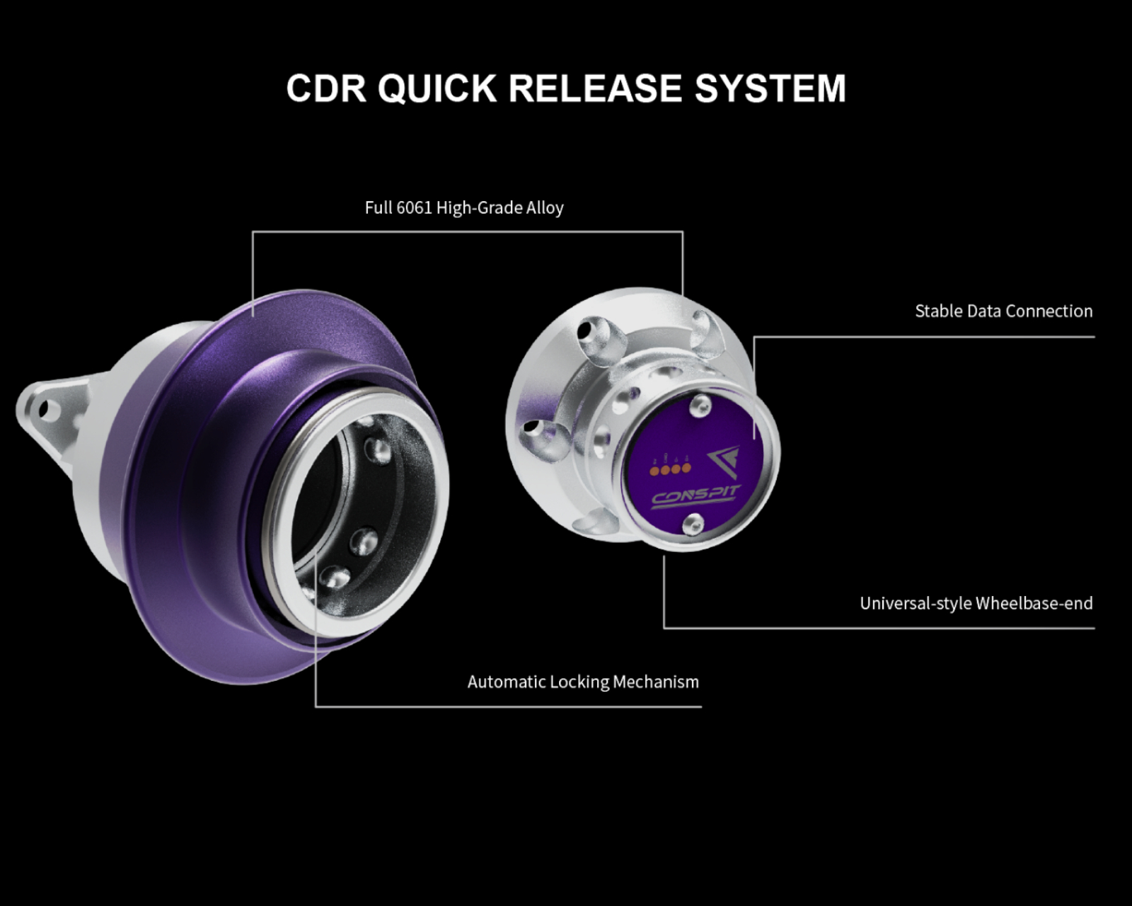 CDR Quick Release är en produkt från Conspit, specifikt utformad för sim-racing. Systemet möjliggör snabb montering och demontering av ratten, vilket underlättar för användare som vill byta mellan olika rattar. Det har en universell design och är mekaniskt kompatibelt med flertalet hjulbaser och rattar som används inom branschen. CDR Quick Release syftar till att förbättra användarupplevelsen i intensiva racing-situationer.Systemet är utrustat med en automatisk låsningsfunktion som förenklar monteringen av ratten. Genom att dra upp låsringen behövs ingen manuell justering, vilket gör användningen enkel och snabb. Vid demontering dras ringen och ratten lossar automatiskt. Dessutom erbjuder systemet pålitlig signalstabilitet tack vare integrerade fjädkontakter, vilket ger en stabil elektrisk anslutning som klarar av miljöer utsatta för elektromagnetisk störning. Denna stabilitet överträffar traditionella trådlösa lösningar.