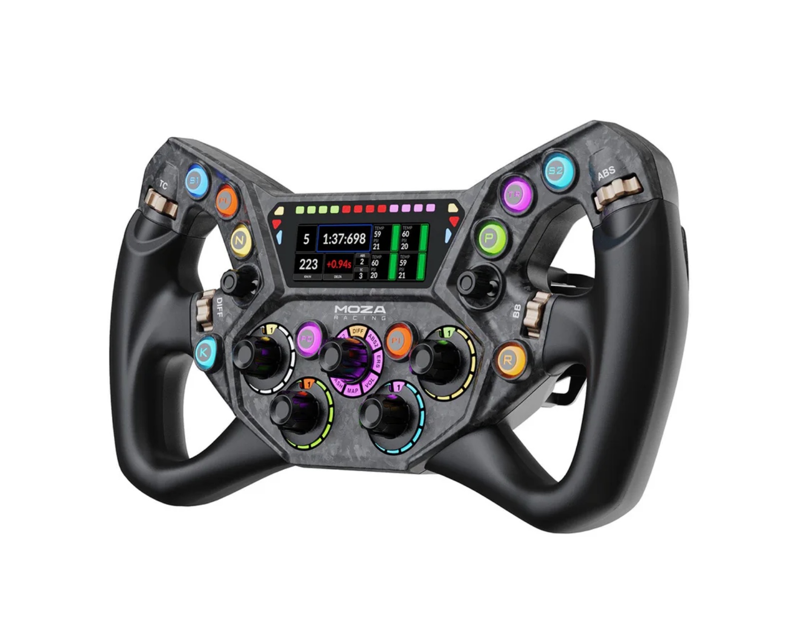 KS Pro Racing Ratt är en ratt från Moza Racing som kombinerar innovativ design och hög prestanda för sim racing-entusiaster. Med en ergonomisk layout och en skärm på 2.99 tum erbjuder rattens intuitiva kontrollsystem en djupgående och anpassningsbar körupplevelse. Den högupplösta skärmen har en upplösning på 268x800 och en uppdateringsfrekvens på 60 Hz, vilket möjliggör detaljerad visualisering av viktig information direkt under racing.Ratten är byggd av ett kolfiberförstärkt kompositmaterial som ger hög hållfasthet utan att kompromissa med vikten, vilket resulterar i en struktur som säkerställer en robust och lätt design. Ratten är utrustad med anpassningsbara RGB-belysningssystem med upp till 16,7 miljoner färgkombinationer, vilket ger användaren möjlighet att snabbt identifiera inställningar. Med tio RGB-varvtalslampor och sex flagglampor kan föraren få realtidsinformation om motorvarv och racetillstånd. Rattens paddlar är tillverkade av magnetiskt kol med Hall-sensorer och erbjuder flera programmatiska funktioner försmidigt växlingsarbete.