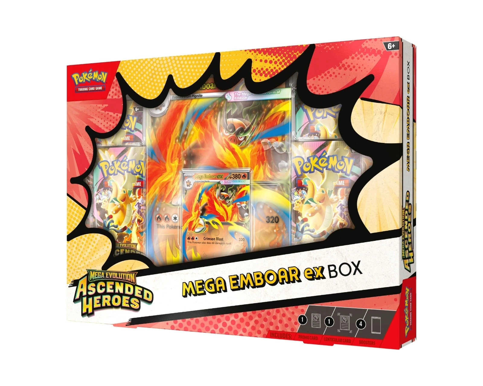 Mega Evolution-Ascended Heroes MEGA ex Box är en samlarprodukt från Pokémon som inkluderar spännande innehåll för både spelare och samlare. Boxen innehåller ett foil promo-kort med Mega Emboar ex eller Mega Feraligatr ex och ett oversize lenticular-kort, vilket ger en visuell dimension till samlingen. Dessutom ingår fyra boosterpaket från Ascended Heroes, vilket möjliggör jakt på sällsynta kort och en kod för Pokémon Trading Card Game Live.Byggd för att tillfredsställa samlarnas och spelarnas behov erbjuder Mega Evolution-Ascended Heroes MEGA ex Box en kombination av kraft och visuell briljans. Promo-kortet med Mega Emboar ex bjuder på Crimson Blast-attacken, känd för sin förmåga att påverka matchstrukturen. Det läckra lenticular-kortet ger en dynamisk 3D-upplevelse, medan boosterpaketen ger möjligheter att utöka samlingen med fler kort, däribland oslagbara legendariska Pokémon.