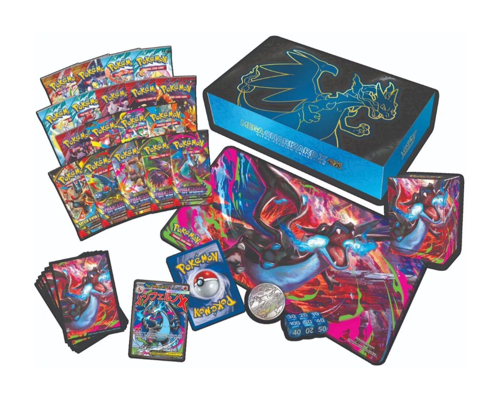 Mega Charizard X ex Ultra-Premium Collection är en produkt från Pokémon som erbjuder en rad specialkort och tillbehör för samlarkortsspel. Samlingen innehåller ett foil promo-kort med Mega Charizard X ex och ett foil promo-kort med Oricorio ex samt olika spelaccessoarer. Innehållet i boxen inkluderar 65 kortfodral prydda med illustrationer av Mega Charizard X, en spelmatta med samma motiv, en kortlåda, ett metallmynt och sex damage-counter-tärningar.Dessutom medföljer 18 booster-paket, vilket ger möjlighet att utöka samlingen. Kvaliteten på korten är standard för Pokémon-kort, och alla kort är designade för att skydda spelaren och ge en unik spelupplevelse. Samlingen är utformad för att stödja både samlande och spelande, vilket gör den idealisk för både nybörjare och erfarna gamers.