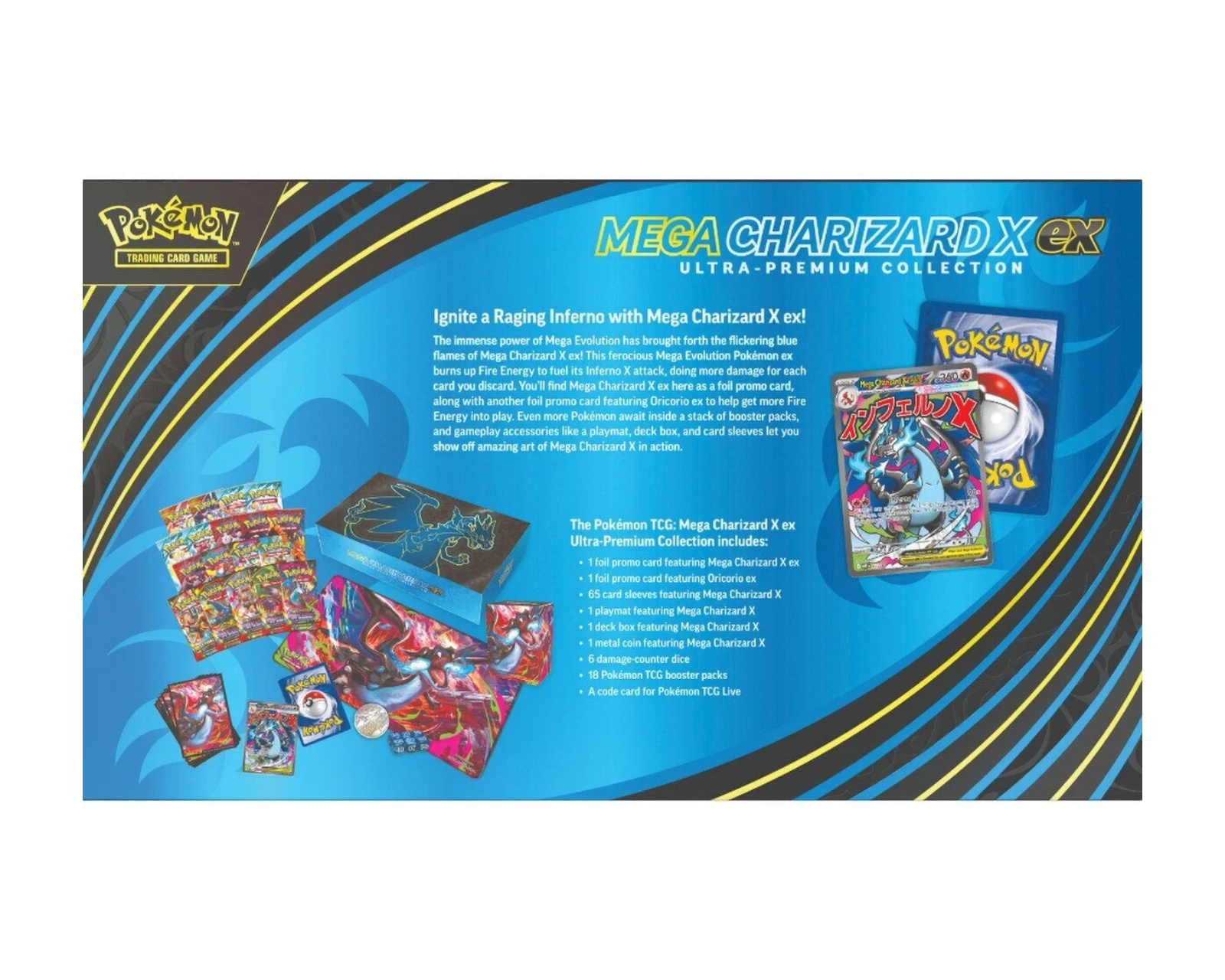 - Innehåller Mega Charizard X ex och Oricorio ex i foil-format