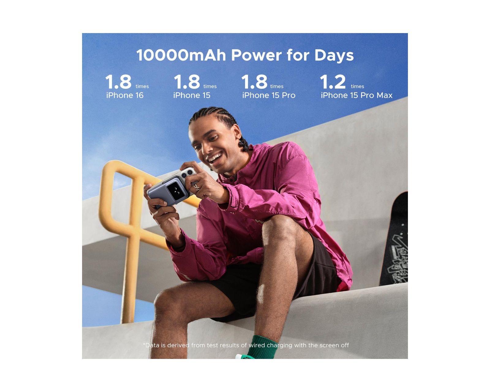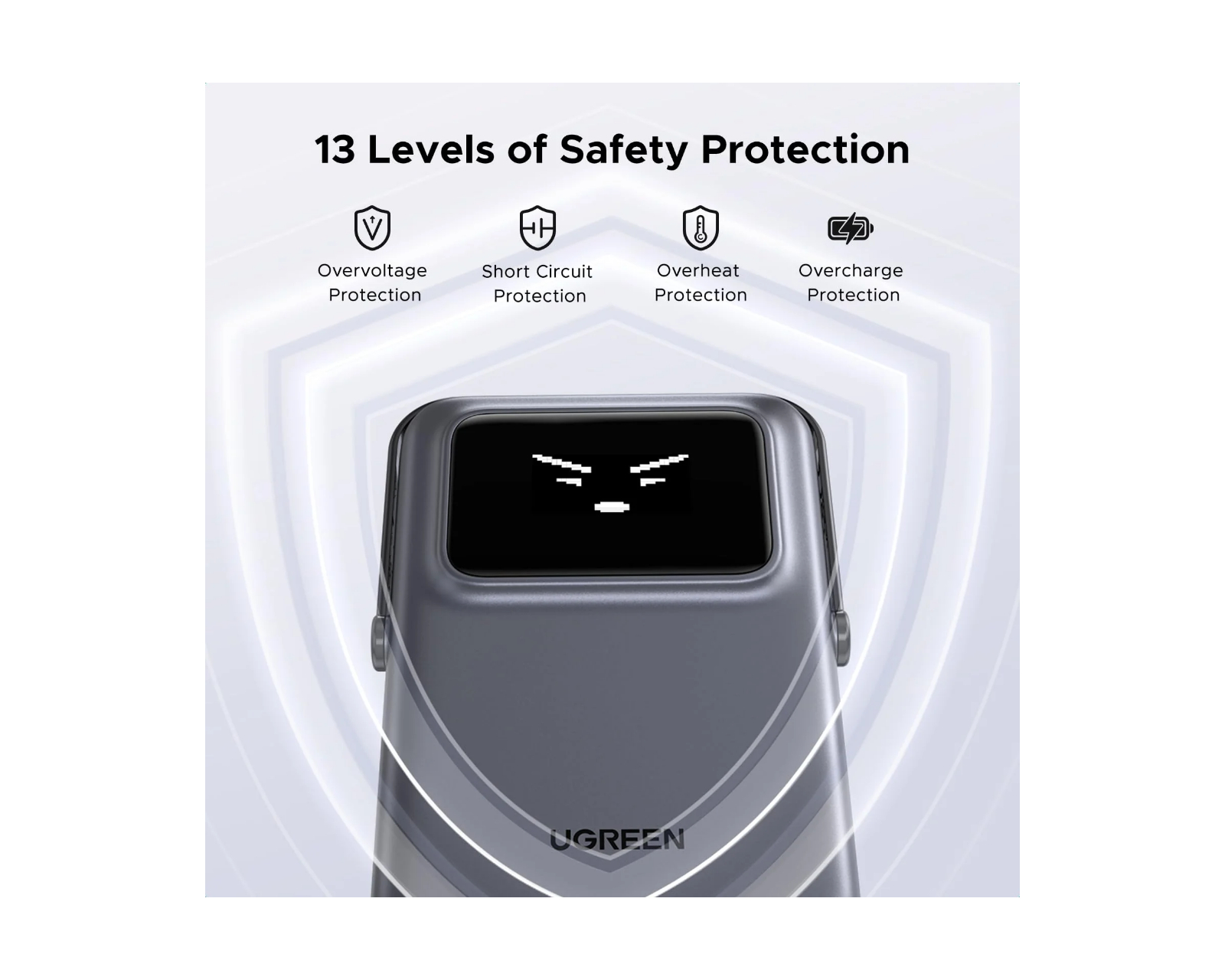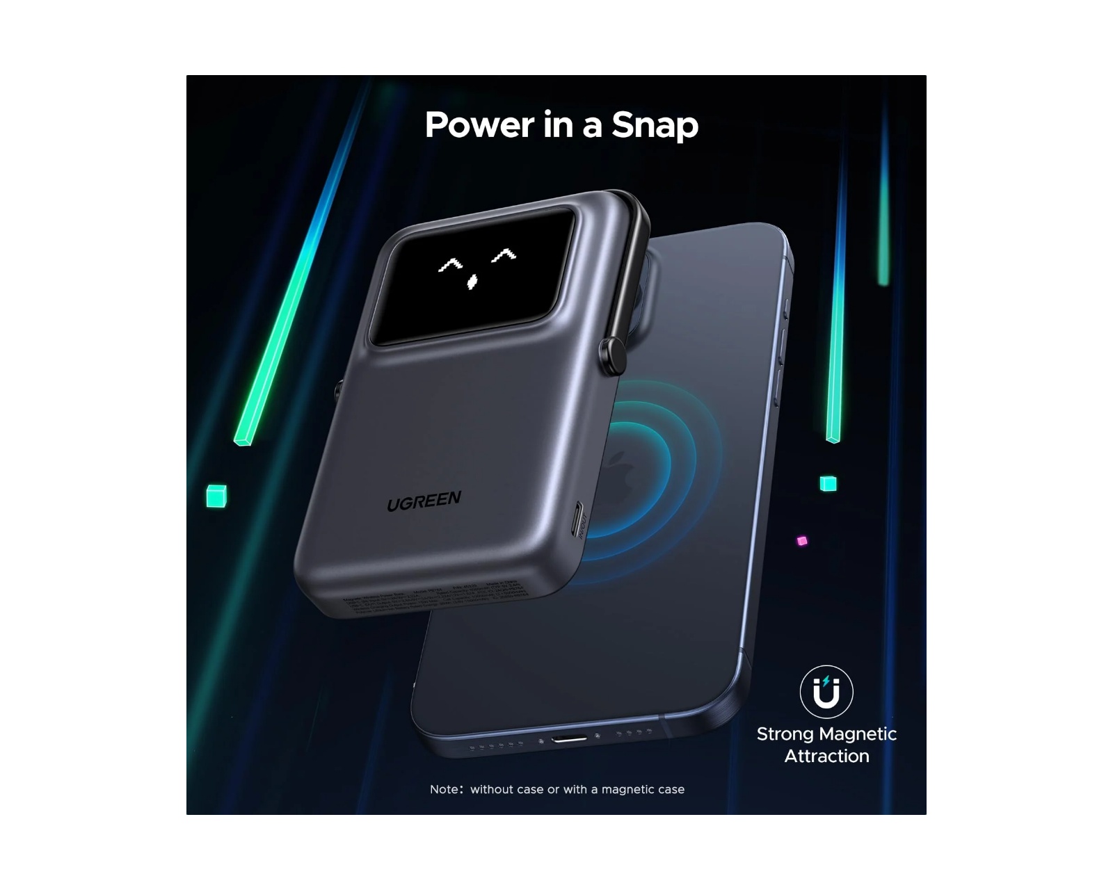 Uno 10000mAh Magnetisk Trådlös Powerbank är en powerbank från UGREEN som erbjuder 20W effektiv laddning och trådlös laddning med magnetisk funktionskapacitet. Med en batterikapacitet om 10000mAh (delad i två celler om 5000mAh), ger den en bedömd kapacitet på 6000mAh vid 5V och 2.4A, vilket gör den lämplig för att ladda olika enheter effektivt. Powerbanken är även utrustad med en smart display som visar status genom emojis. Den är designad för både vardagliga och mer krävande användningar.Powerbanken har ett USB-C ingång/utgång, vilket stödjer 5V/3A, 9V/2.22A, och 12V/1.5A, samt en maximal effekt på 20W. Utöver detta har den trådlös laddning med en effekt på 7.5W. Med flera skyddsfunktioner mot överladdning, överurladdning, överström, överkraft, överspänning, övertemperatur, kortslutning och elektromagnetiska fält, är enheten både säker och pålitlig. Laddningstiden är cirka 2,5 timmar med en PD20W-laddare, och dess kompakta dimensioner (L106xW70xH22 mm) gör den lätt att bära.