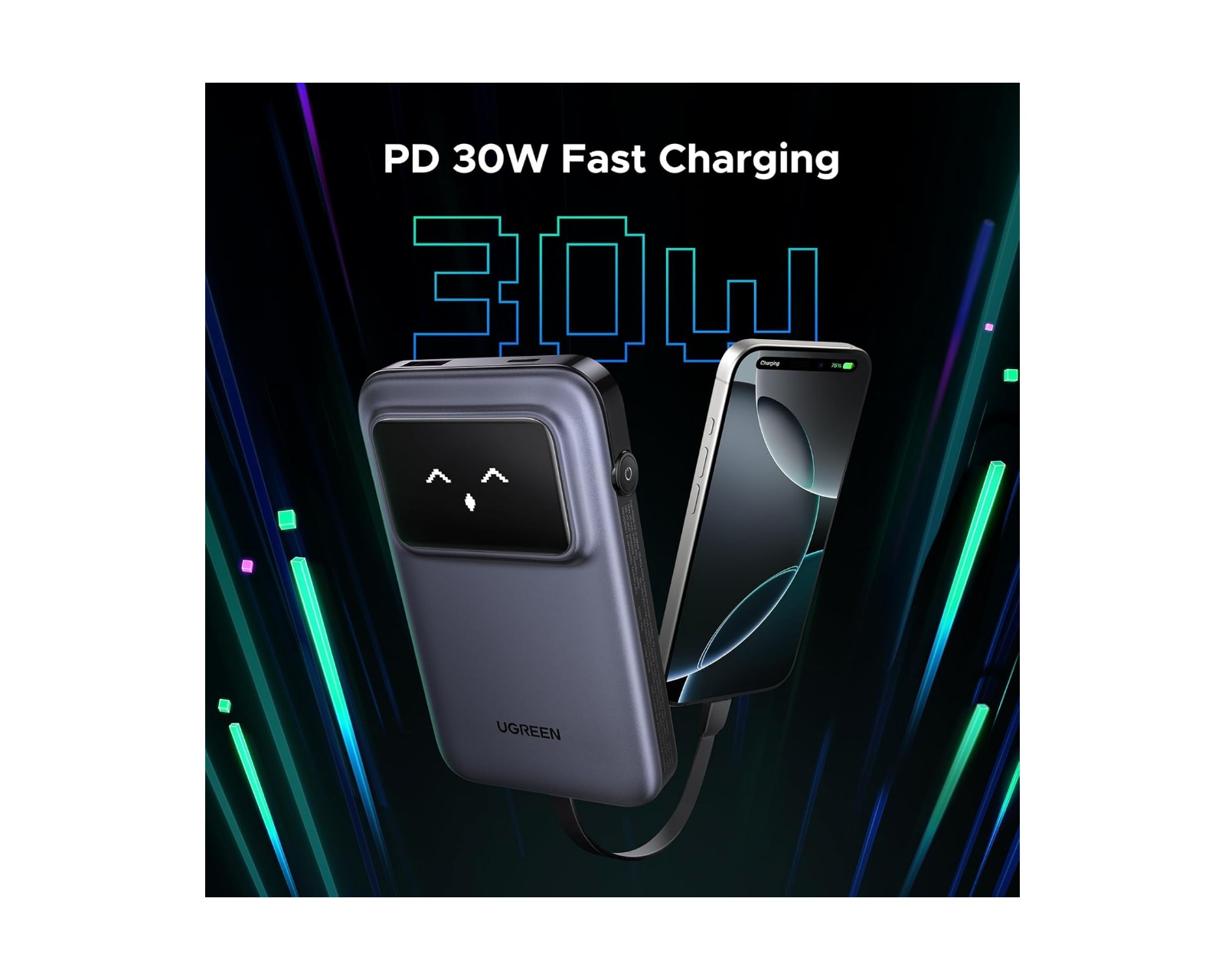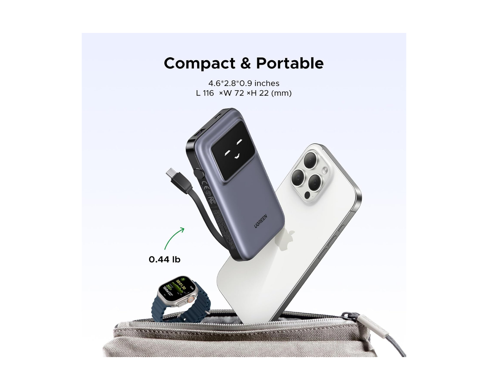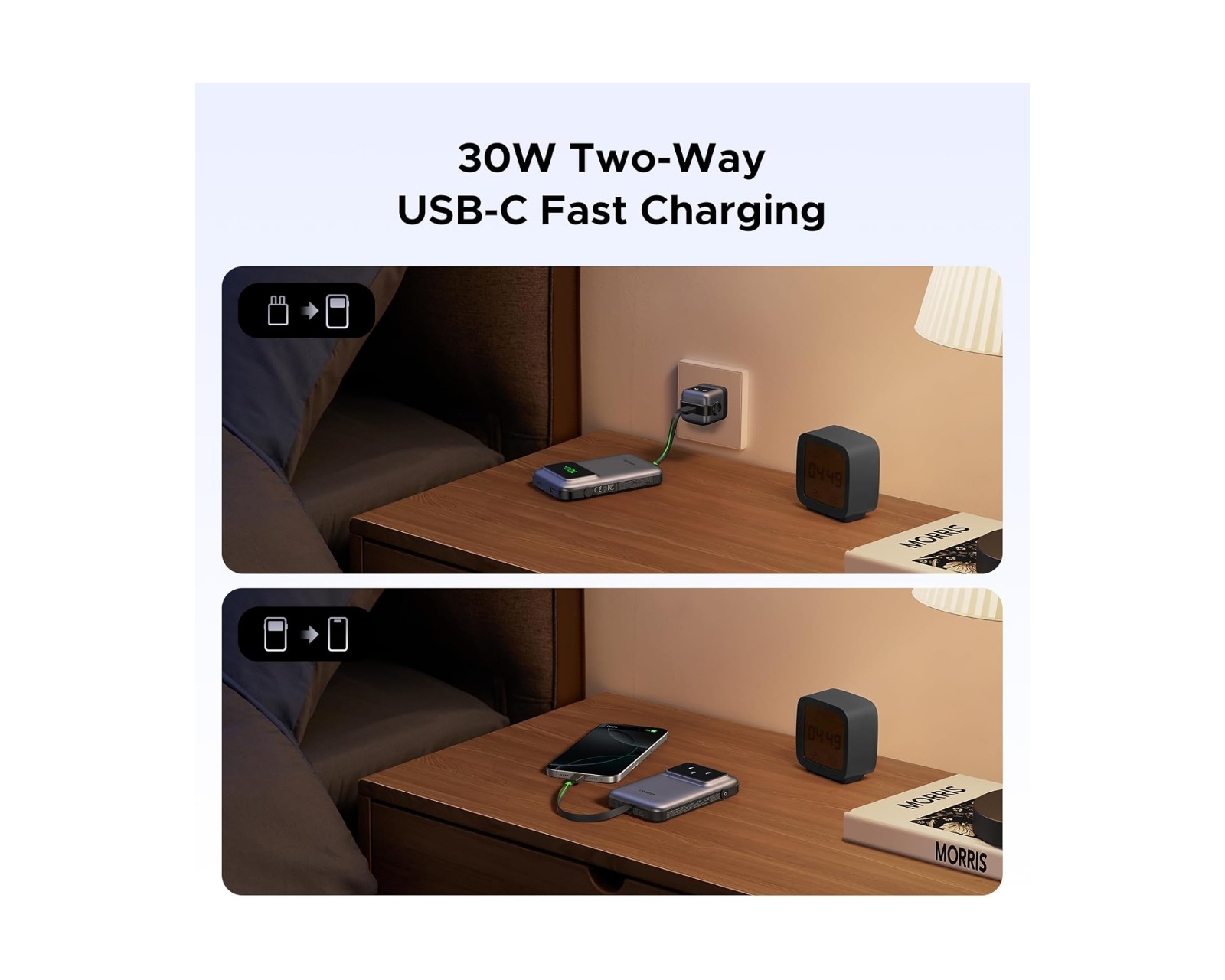 USB-C Input/Output stöder 5V/3A, 9V/3A, 12V/2.5A och 15V/2A upp till 30W, medan USB-A Output erbjuder 5V/3A, 9V/2A och 12V/1.5A upp till 22.5W. Den inbyggda USB-C kabeln har samma kraftfulla kapacitet som porten, med stöd för upp till 30W. Total output är 5V/3A med en maxeffekt på 15W, vilket gör den perfekt för att ladda smartphones, surfplattor och andra USB-enheter snabbt och effektivt.