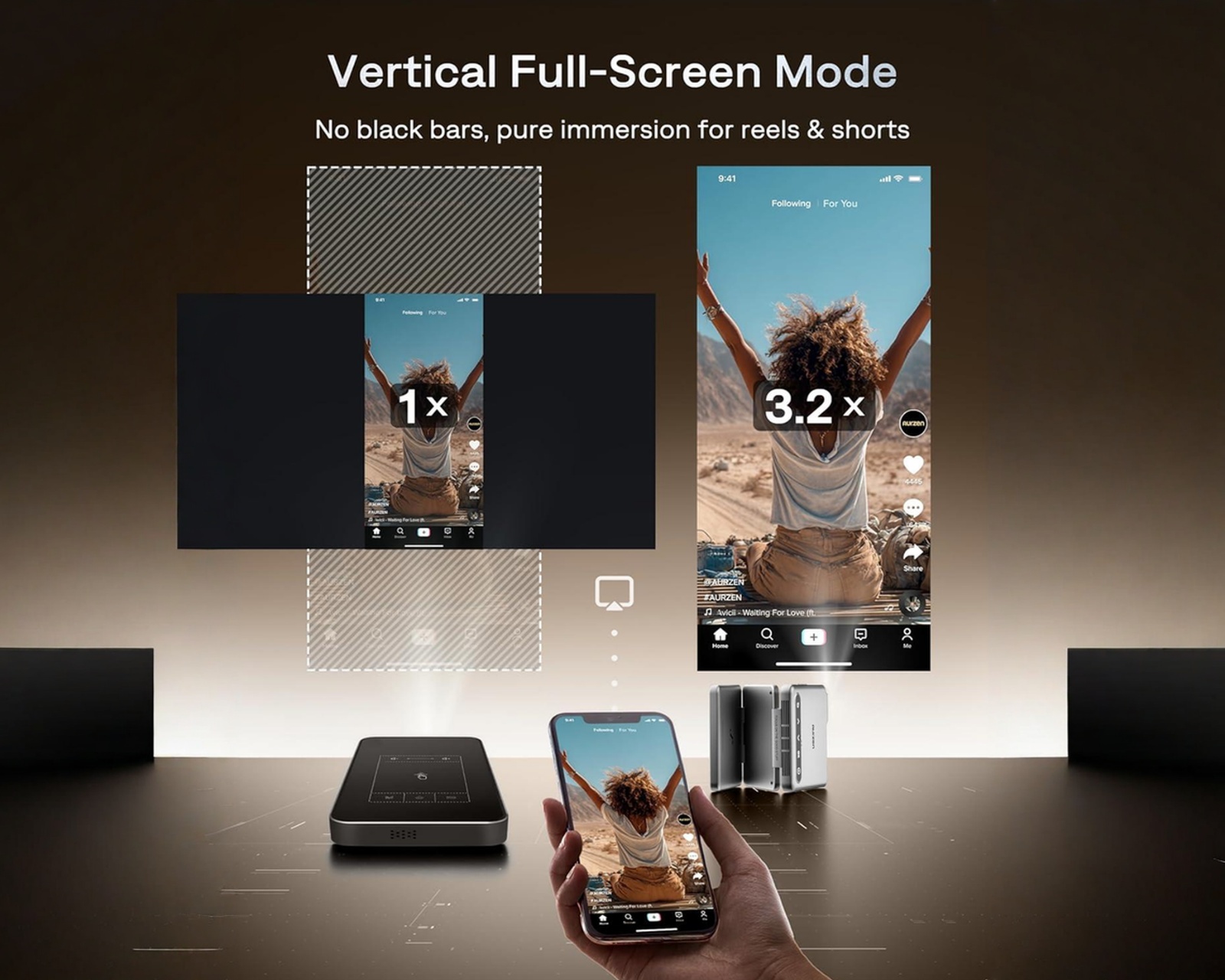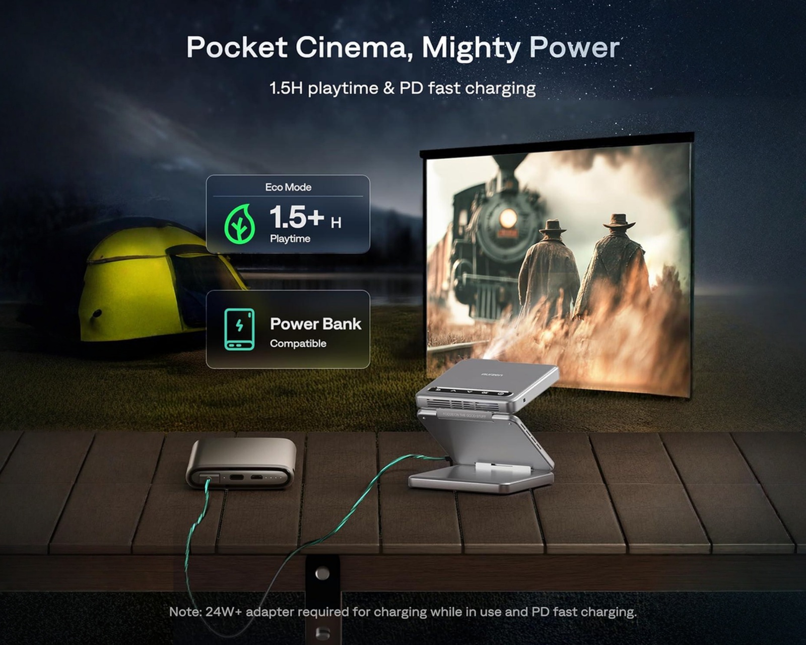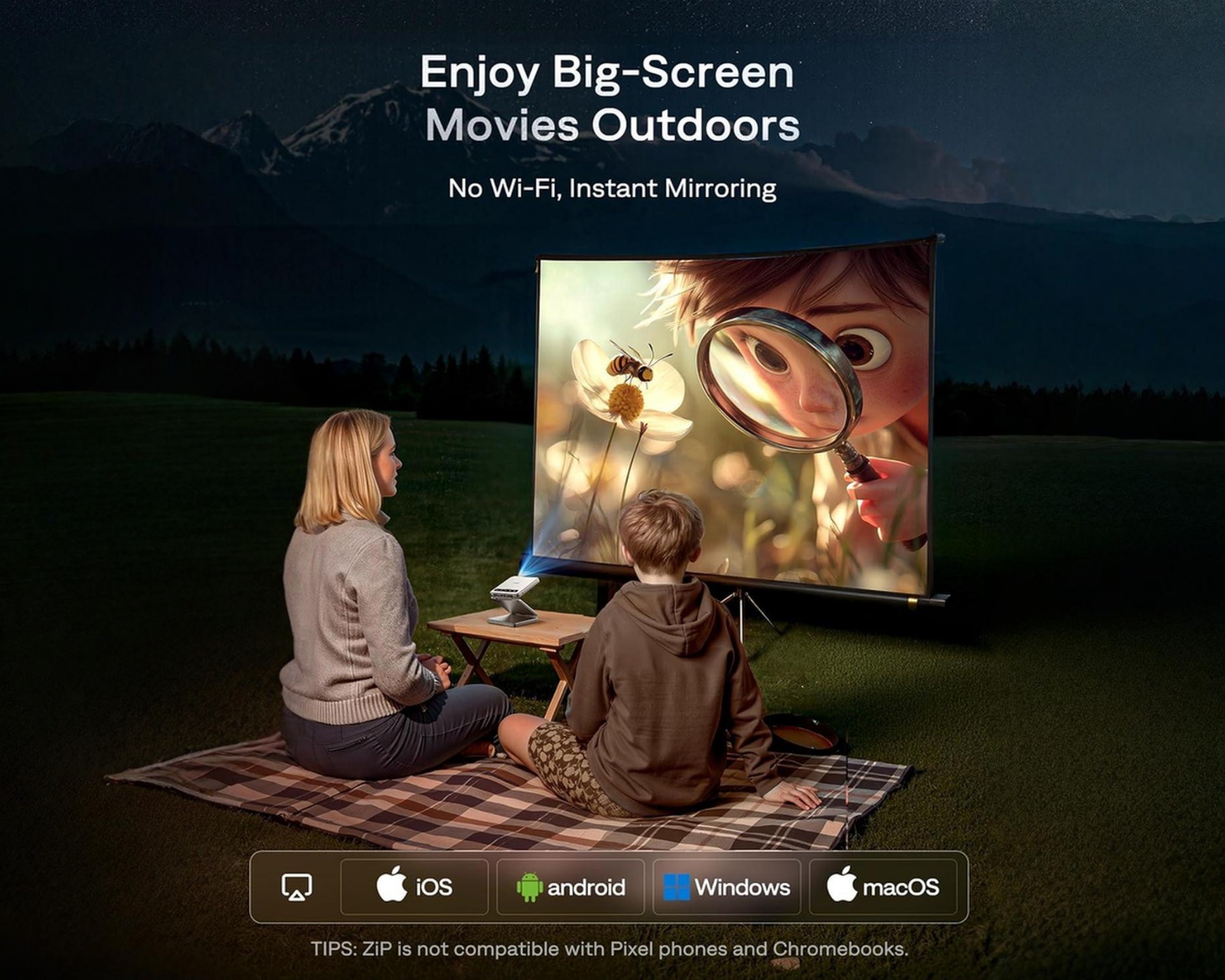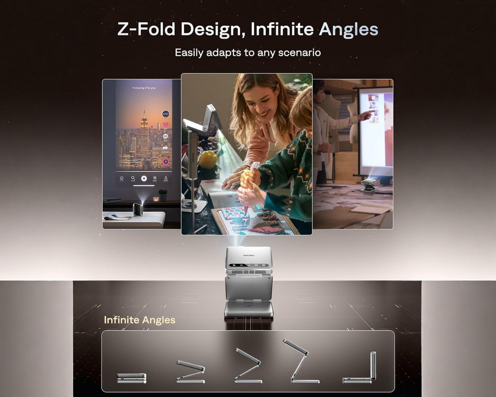 Aurzen ZIP Tri-Fold Portable Mini Projektor är en unik och mångsidig projektor från Aurzen som kombinerar portabilitet och hög kvalitet. Denna tri-fold projektor erbjuder en upplösning på 720p och är designad för att kunna fällas ihop till en kompakt storlek, vilket gör den enkel att ta med sig överallt. Dess inbyggda batteri ger upp till 1,5 timmars speltid och stödjer snabbladdning via USB-C, vilket gör att du kan njuta av filmer och presentationer på språng.Projektorn är byggd med avancerad DLP-teknologi vilket ger levande färger och hög bildkvalitet, perfekt för att visa detaljerade bilder och videor. Enheten använder en 5000mAh batteri och erbjuder instant mirroring utan behov av Wi-Fi, vilket gör den kompatibel med olika enheter som iOS, Android och Windows. ZIP Tri-Fold har dessutom en intelligent automatisk fokusering som fungerar utan fördröjning, vilket innebär en smidig användarupplevelse. Den är perfekt för såväl hemmabruk som professionella presentationer.