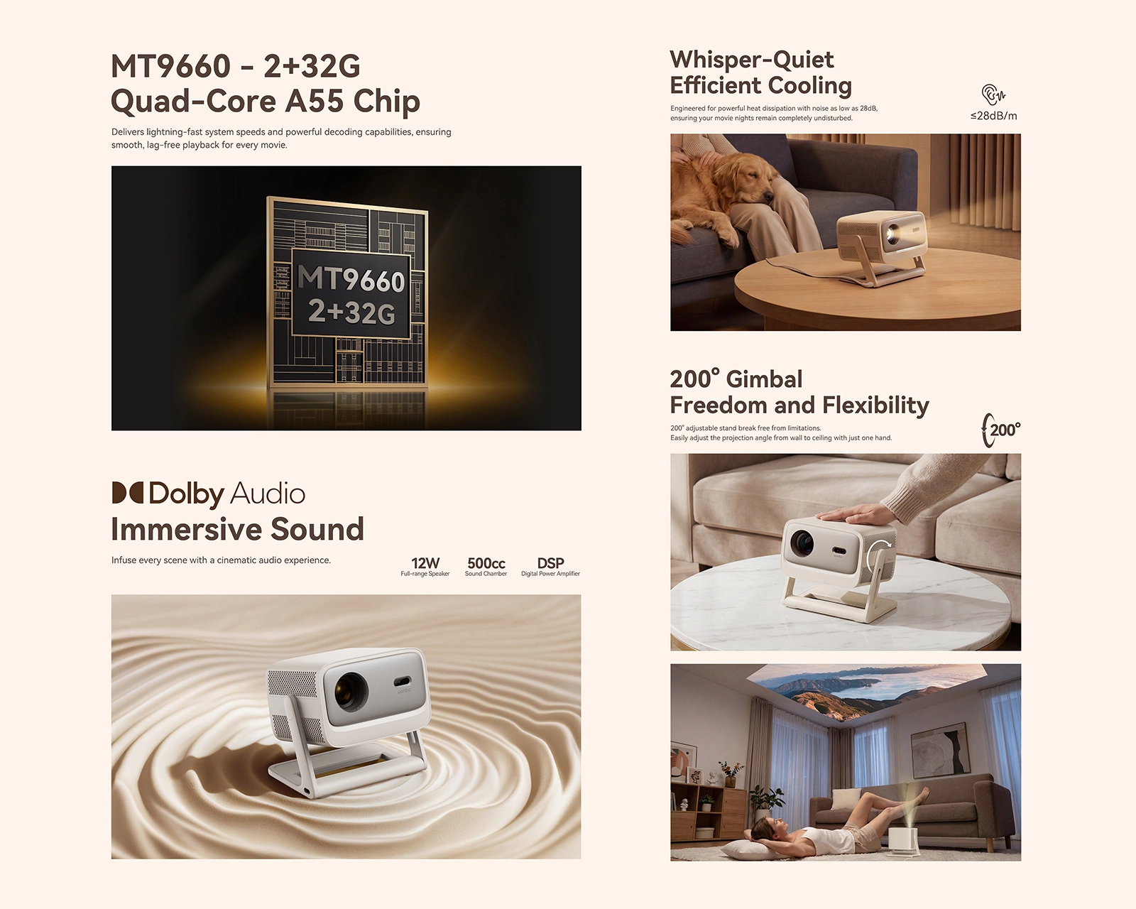Wanbo särskiljer sig genom stark produktdesign, strikt kvalitetskontroll och ett konsekvent användarfokus. Med egen produktionskapacitet och strukturerade kvalitetsprocesser levererar varumärket tillförlitliga och högpresterande projektorer anpassade för moderna och flexibla användningsmiljöer.