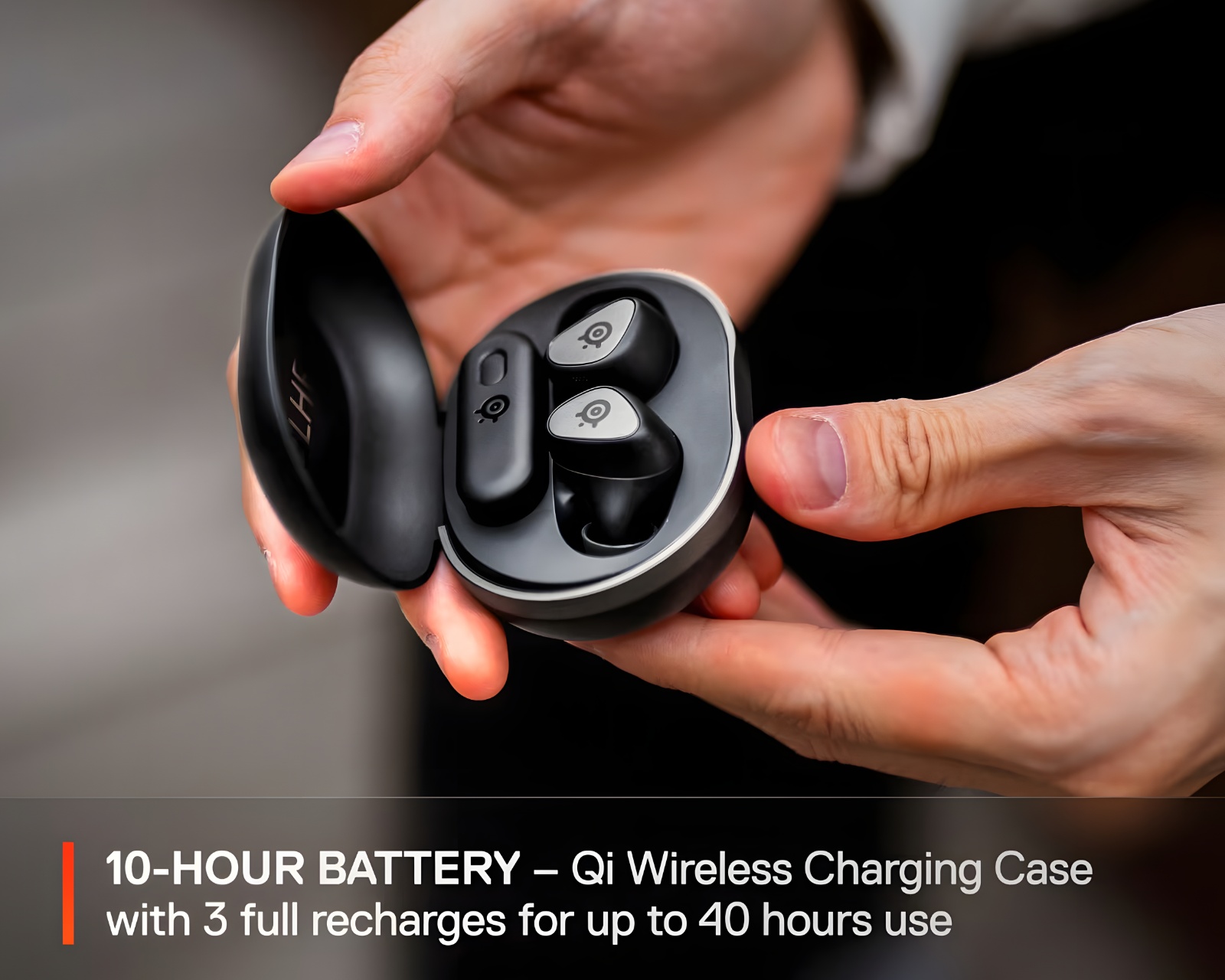 GameBuds har en imponerande batteritid på 10 timmar, vilket gör att du kan njuta av dina spel utan avbrott. Dessutom erbjuder det medföljande fodralet en extra batterikapacitet på 30 timmar, vilket innebär att du kan ladda dina hörlurar flera gånger innan du behöver koppla in dem igen. Detta gör GameBuds till det perfekta valet för spelare som är på språng eller spelar långa sessioner.