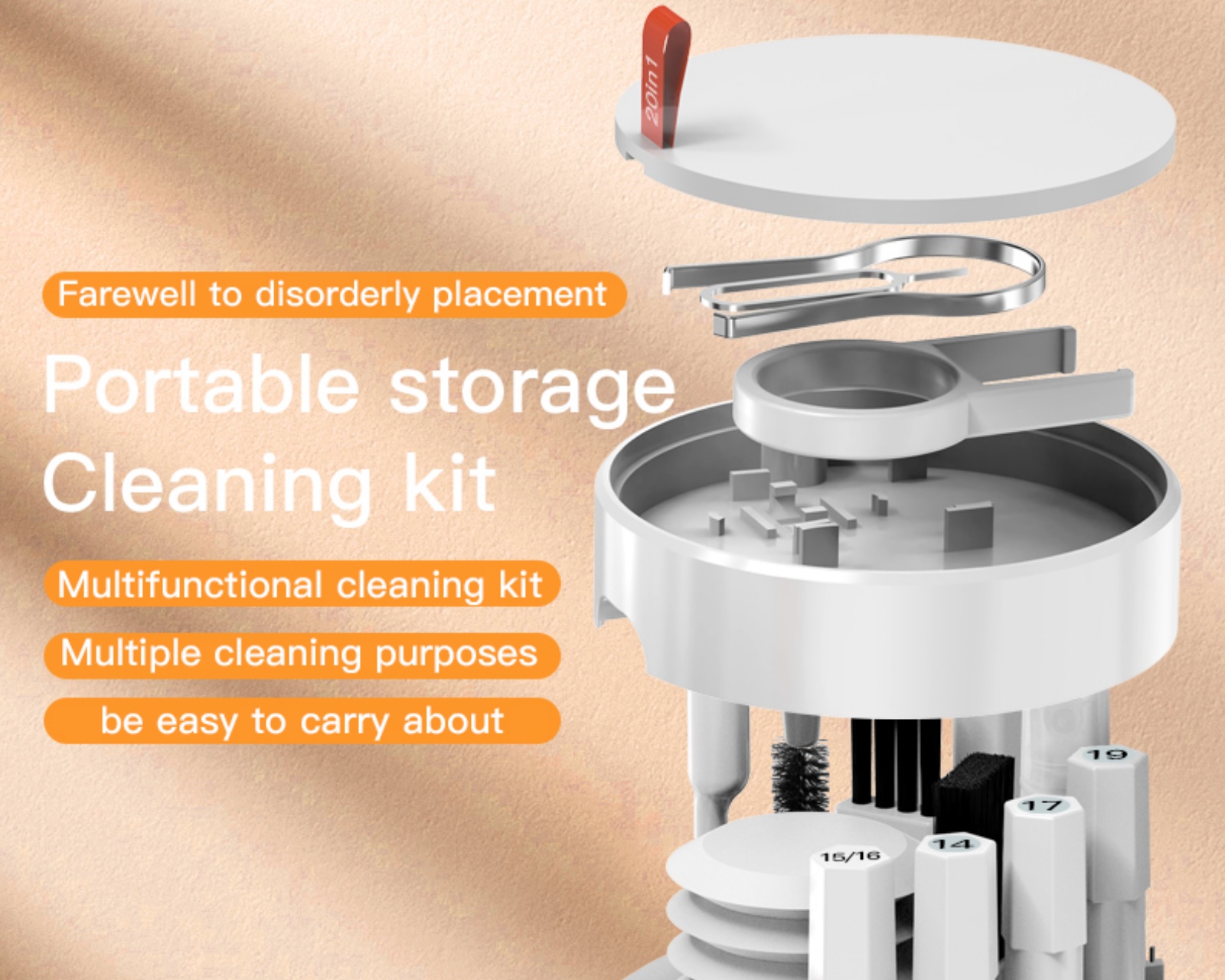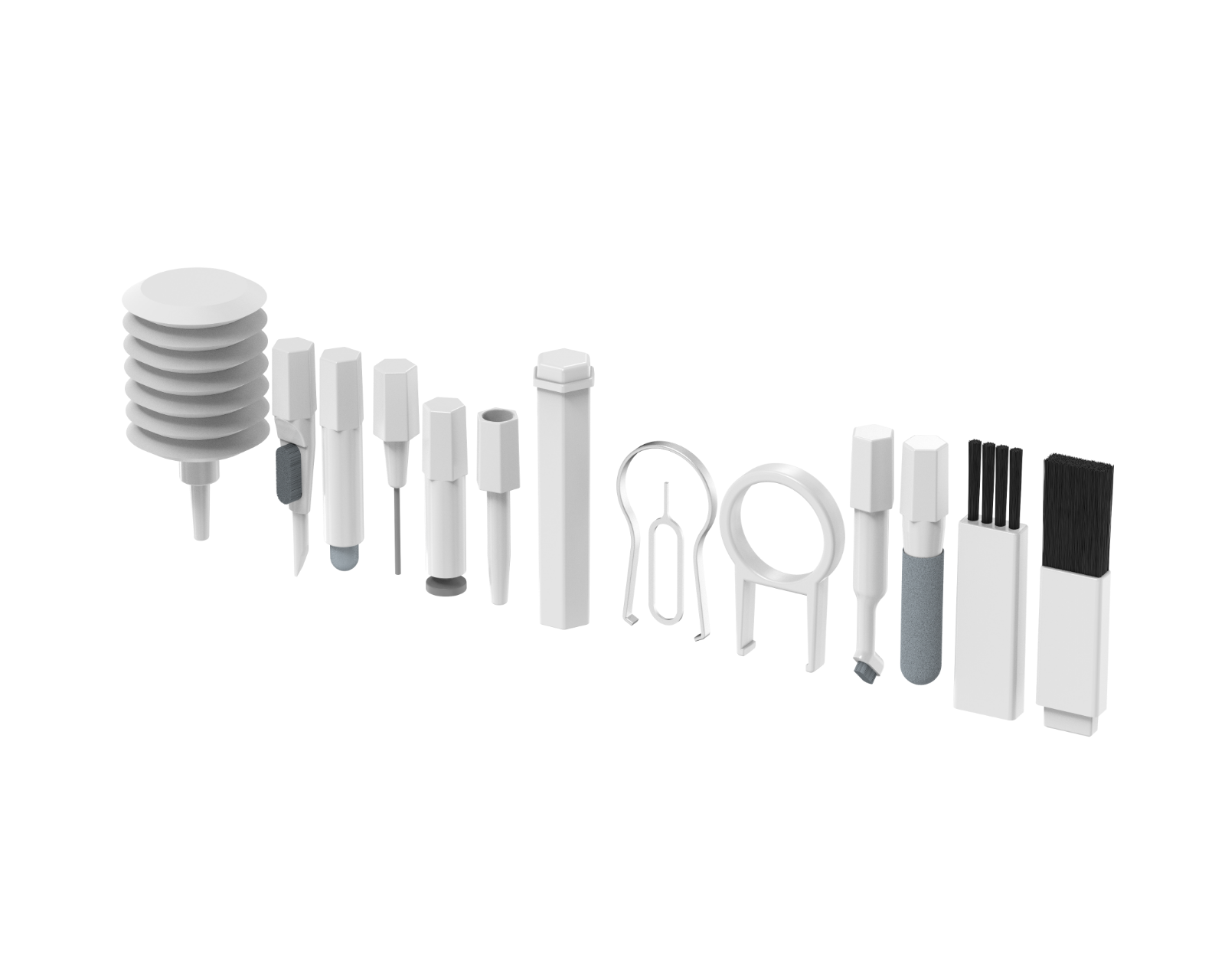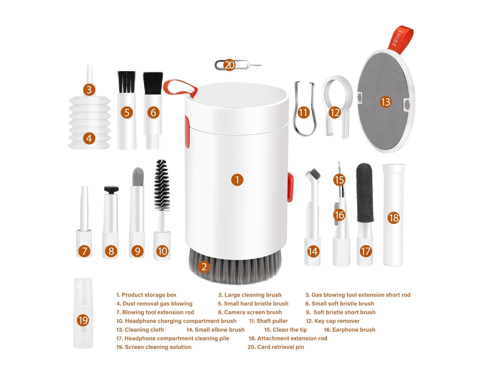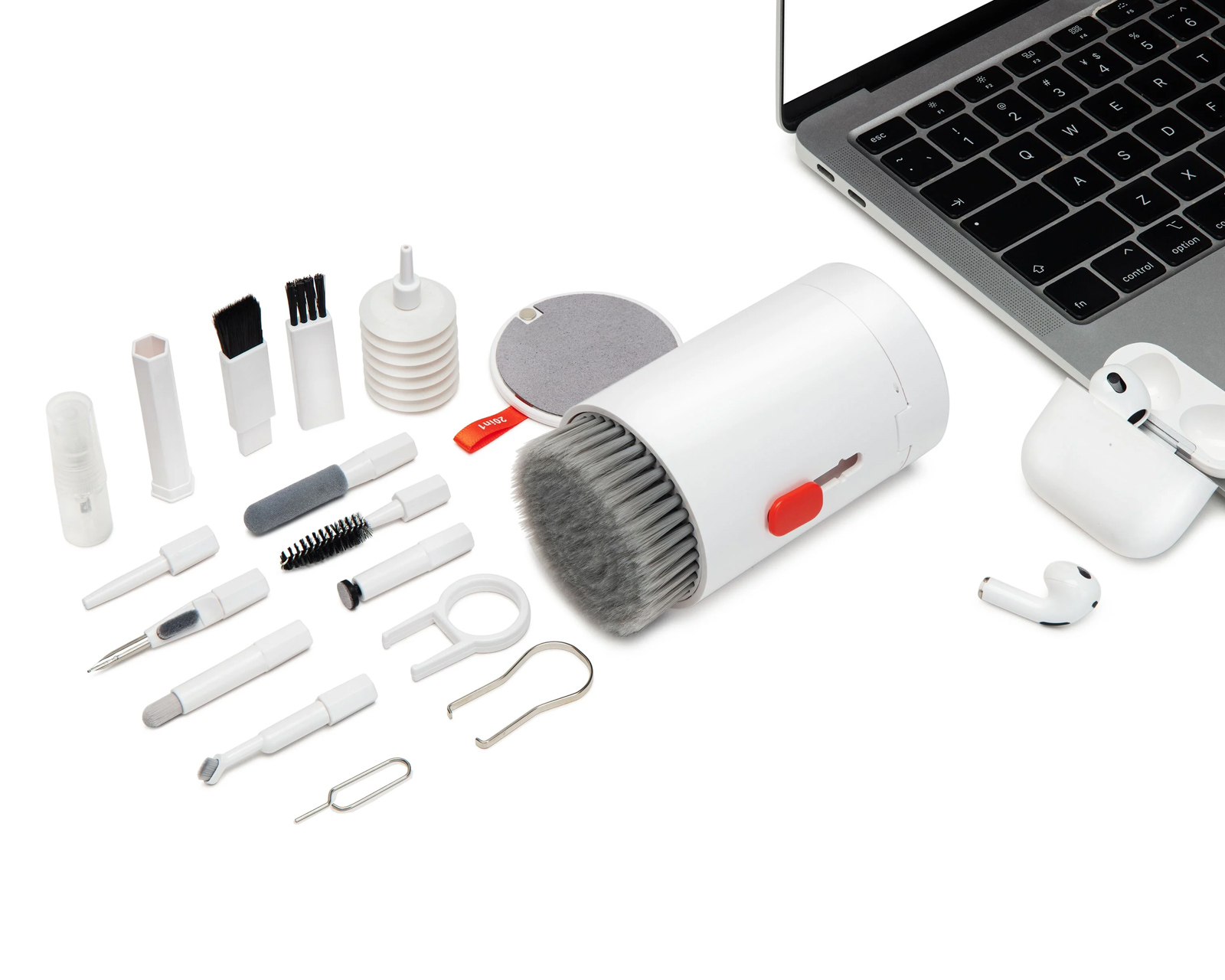 20-i-1 Rengöringskit är ett rengöringsset för hemelektronik från MaxMount som syftar till att underlätta underhållet av olika elektroniska enheter. Setet innehåller 20 delar, inklusive olika typer av borstar, rengöringsduk, dammblåsare och förvaringsetui. Det lämpar sig för rengöring av mobiltelefoner, surfplattor, datorutrustning och andra elektroniska apparater.Rengöringskitet innehåller flera specialverktyg, vilket gör att användaren kan nå svåråtkomliga områden i små elektriska enheter. Borstarna inkluderar en stor rengöringsborste för damm på större ytor, en liten borste med hårda borst för fastsittande smuts samt specialiserade borstar för hörlurar och laddningsfodral. Rengöringsduken är av mikrofiber och säkerställer repfri rengöring av skärmar. En luftblåsare hjälper till att snabbare ta bort damm från svåråtkomliga ställen. Förvaringsetuiet gör att alla verktyg kan hållas organiserat.