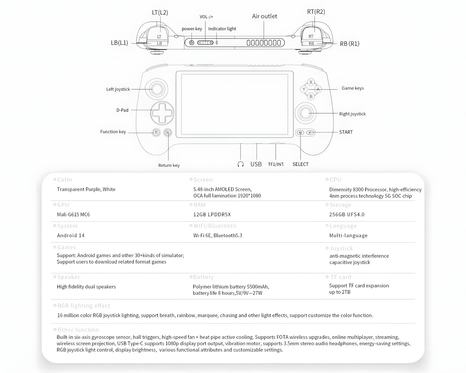 RG557 är en retro-emulator från Anbernic som möjliggör spelande av både klassiska och moderna spel samt emulatorer. Den är byggd på en Dimensity 8300-processor som stödjer effektiv multitasking och gamingprestanda. Med ett 5,48-tums AMOLED-skärm och en upplösning på 1920x1080 är den även kapabel att hantera HD-innehåll. RG557 riktar sig mot spelentusiaster och retro gaming-fans.Denna konsol är utrustad med en åttakärnig processor och en Mali-G615-grafikprocessor, vilket ger snabb och smidig grafikrendering. Med 12 GB LPDDR5X RAM och 256 GB UFS 4.0 lagringsutrymme kan användare lagra fler än 8000 spel. RG557 kör Android 14 och stöder både WiFi 6E och Bluetooth 5.3 för stabil trådlös anslutning. En 5500 mAh polymer-lithiumbatteri ger cirka 8 timmars användning, och konsolen har en omfattande uppsättning portar inklusive USB Type-C och 3,5 mm ljudutgång för headset. Med RGB-ljuseffekter och en inbyggd sexaxlad gyroskopsensor erbjuder den också ytterligare funktionalitet för en mer dynamisk spelupplevelse.