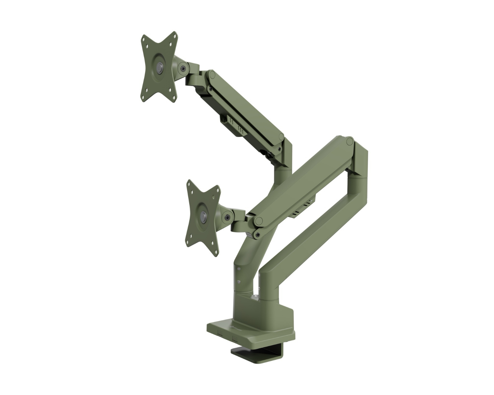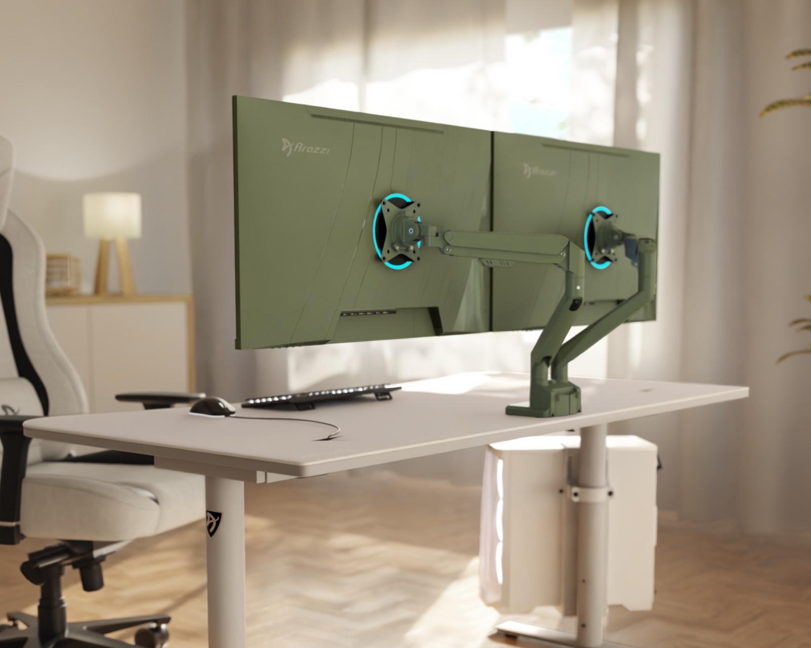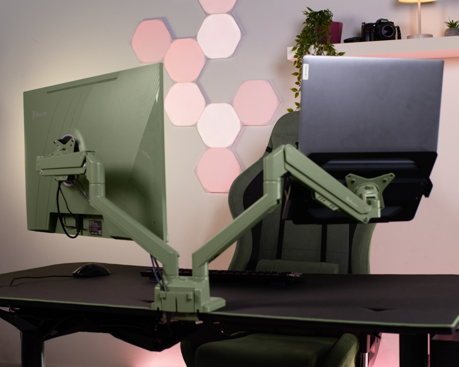 Alzare Neo Duo Skärmstativ är en produktkategori för datortillbehör från Arozzi som erbjuder en stabil lösning för att montera upp till två skärmar. Detta skärmstativ stödjer en maximal vikt av 9 kg per skärm och är utrustat med VESA-fästen på 100x100 mm och 75x75 mm. Den gröna färgen ger ett distinkt utseende som passar in i många kontors- och spelmiljöer. Tack vare sin design är stativet lämpligt för både spelare och kontorsanvändare som vill optimera sin arbetsyta.Byggd i stål, erbjuder Alzare Neo Duo en hög hållbarhet och stabilitet. Stativen kan justeras för lutning mellan +45° och -45°, samt svängas in åt två håll med ett svängområde på +90° till -90°. Rotation på 360° ger ytterligare flexibilitet vid justering av skärmarna. Klämman gör installationen enkel och möjliggör en smidig fästning till ett skrivbord. Med kabelhantering integrerad, kan användare organisera kablar för att minska klämrisk och hålla arbetsytan fri från röran.