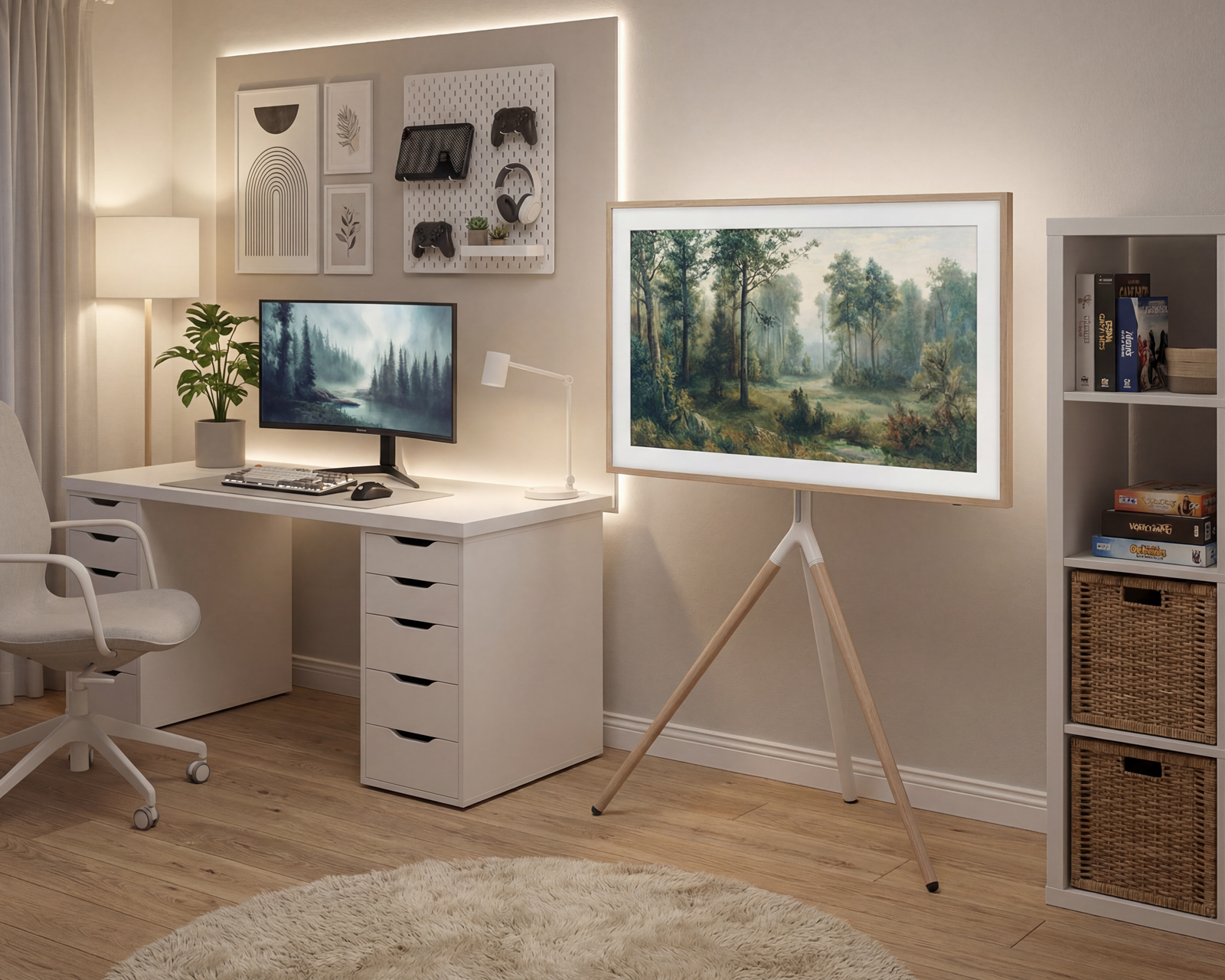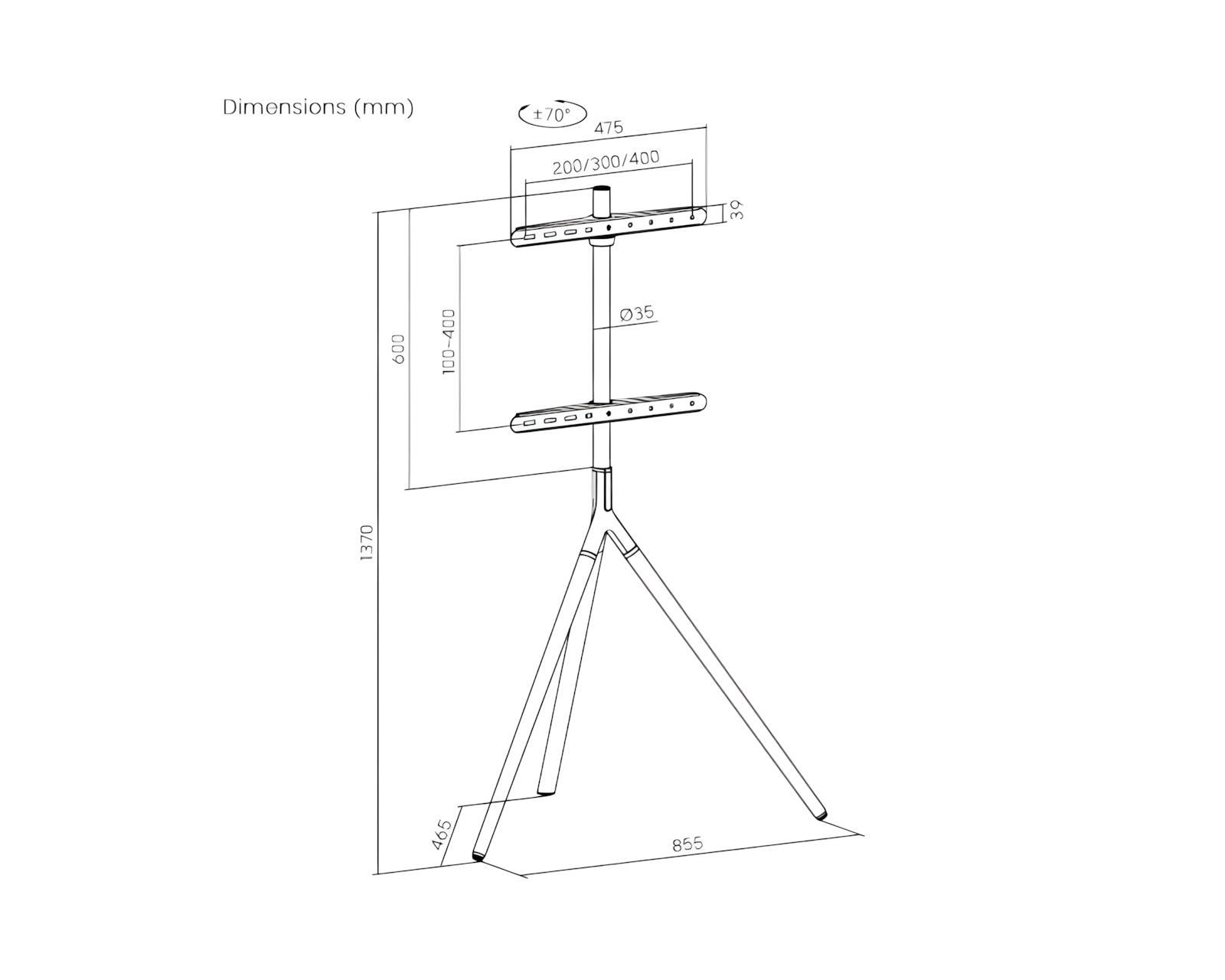 Tripod Stativ för TV 45"-65" är en tv-stativ från MaxMount som kombinerar enkelhet och elegans i sin design. Med kapacitet att stödja skärmar upp till 65 tum erbjuder stativet en svängbar funktion som tillåter justering av visningsvinkeln mellan +70° och -70°. Stativet är lämpligt för både hemmabruk och professionella miljöer och tillverkas av en stabil kombination av stål, aluminium och plast.Konstruktionen av stativet säkerställer att det är både hållbart och stabilt under användning med en viktkapacitet på 32 kg. De kompakta dimensionsmåtten på 855x465x1370 mm gör det lätt att integrera i olika rum. Modellen är VESA-kompatibel med standarder som sträcker sig från 200x200 mm till 400x400 mm, vilket gör den kompatibel med ett brett spektrum av TV-modeller. Med hjälp av skyddande pads förhindras oönskade glidningar och repor på golvet, samtidigt som kabelhanteringen bidrar till att hålla kablarna organiserade och dolda. Stativet levereras dessutom med ett säkerhetskit för att förhindra oavsiktlig tippning.
