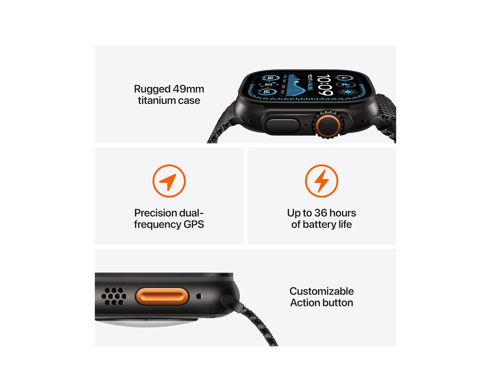 Apple Watch Ultra 2 är en smartklocka som kombinerar robust design med avancerade hälso- och fitnessfunktioner. Den är utrustad med en Retina OLED-skärm och fungerar i både 4G LTE- och Bluetooth 5.3-nätverk. Med fler än tre mikrofoner och dubbla högtalare är ljudet kristallklart för alla samtal och meddelanden.Byggd av titanium och designad för att motstå extrema förhållanden, har Apple Watch Ultra 2 en vattentålighet upp till 100 meter och är även korrosions- och dammtålig. Den omfattande hälsoövervakningen inkluderar sensorer för EKG, hjärtfrekvens och temperatur, vilket ger en noggrann bild av användarens hälsa. Den ständigt aktiva displayen, skyddad av safirglas, säkerställer att information alltid är lättillgänglig och synlig även under starkt solljus.