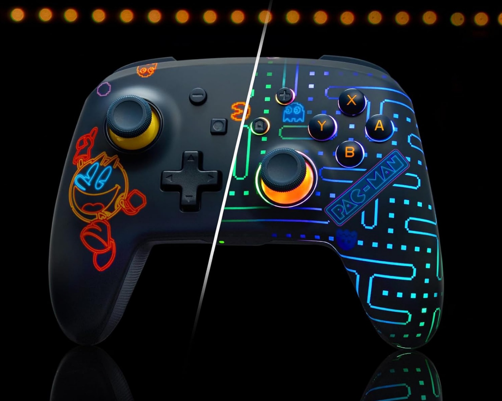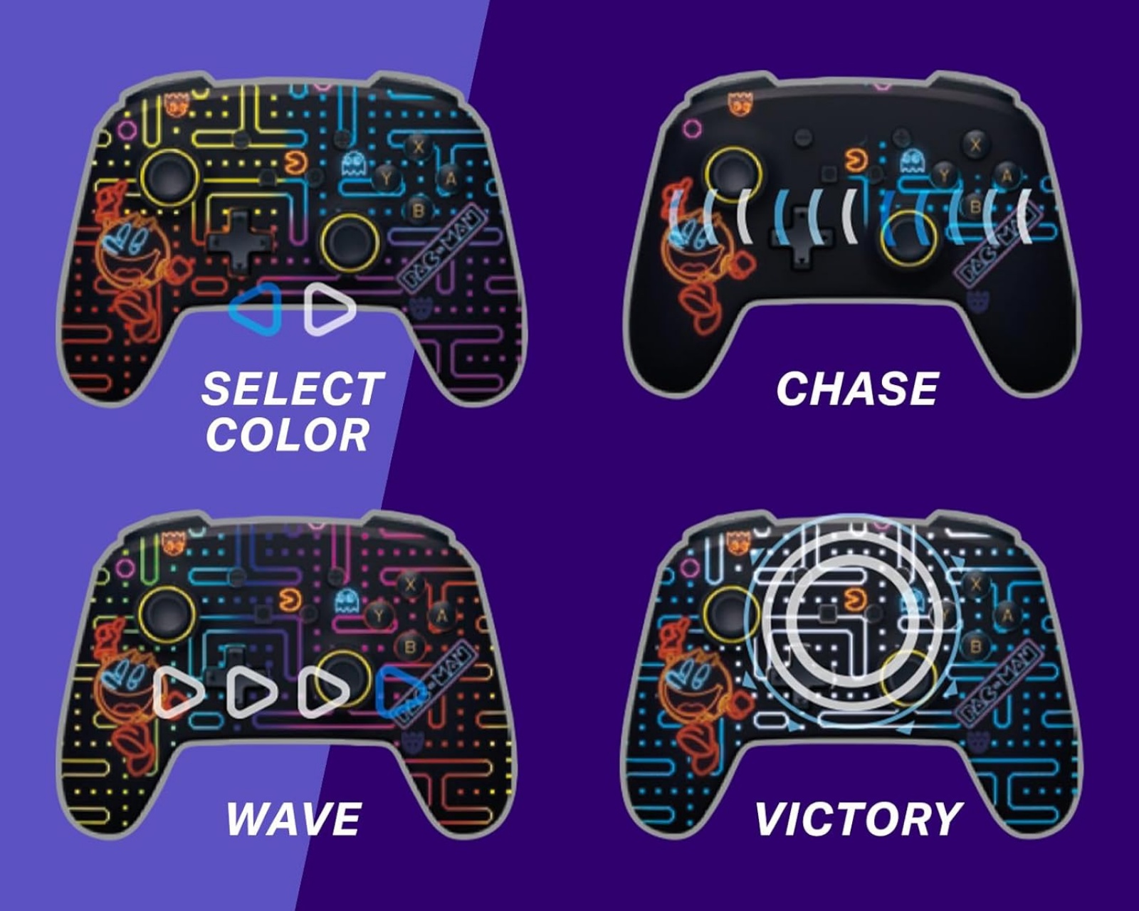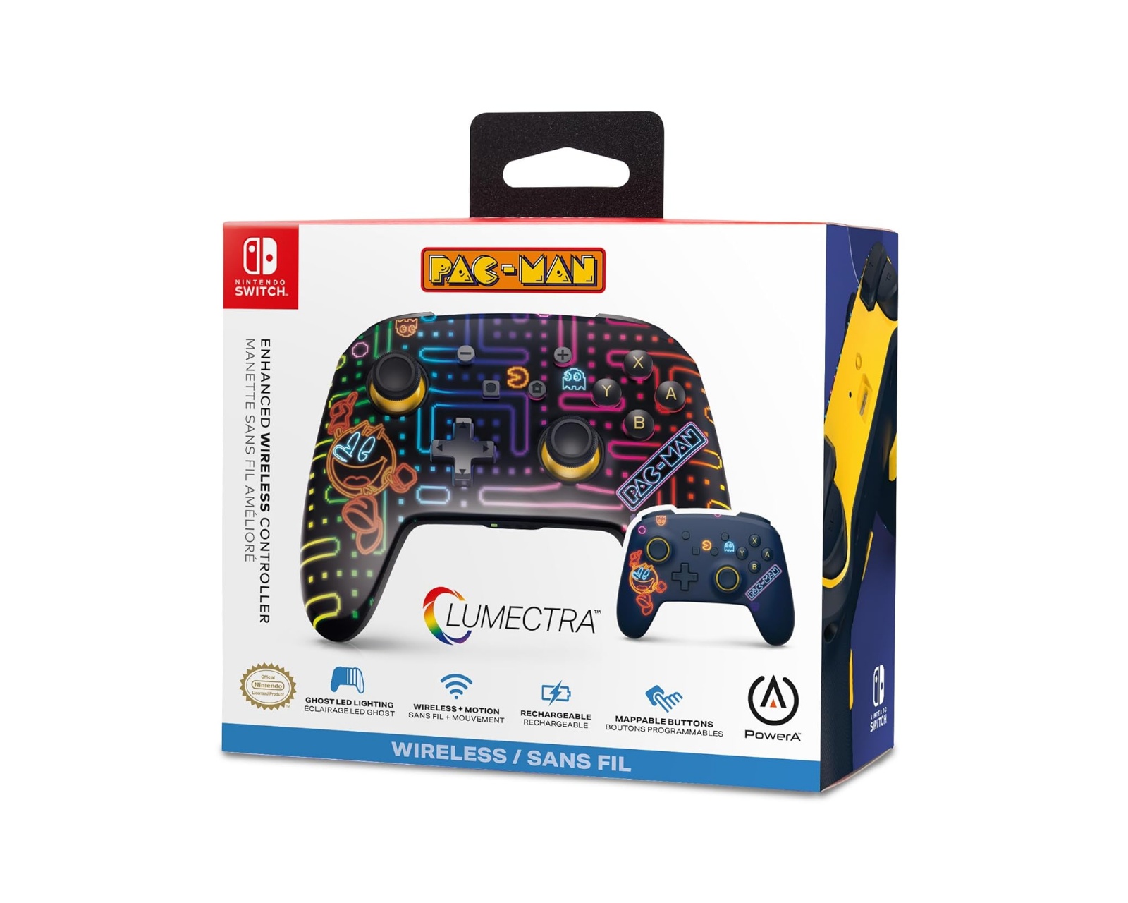 Enhanced Trådlös Kontroller för Nintendo Switch - Pac Man (Neon Arcade) är en spelkontroll från PowerA, designad för användning med Nintendo Switch, Nintendo Switch OLED Model och Nintendo Switch Lite. Kontrollen har en inbyggd RGB LED-belysning som framhäver ett dolt PAC-MAN-mönster och har fyra unika ljuslägen. Dessutom erbjuder den avancerade spelknappar som kan programmeras under spelets gång för förbättrad prestanda.Kontrollen är utrustad med en återuppladdningsbar batteri som ger upp till 10 timmars speltid på en enda laddning. Den medföljande USB-C-kabeln är 3 meter lång, vilket möjliggör samtidig spelning och laddning. Tack vare det trådlösa systemet kan användaren spela fritt på sin konsol. Kontrollen har också rörliga sensorer för mer responsiv spelkontroll och intuitiv navigering inom spelet. Den ergonomiska designen inkluderar ett välbekant layout med texturerat grepp på baksidan och texturerade analoga spakar.
