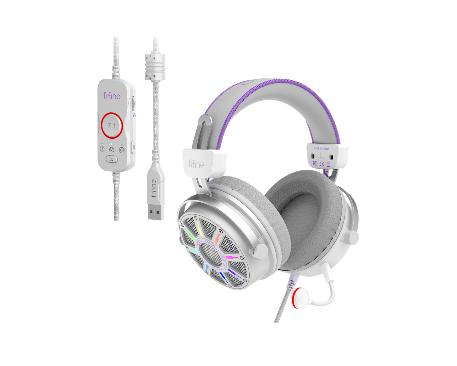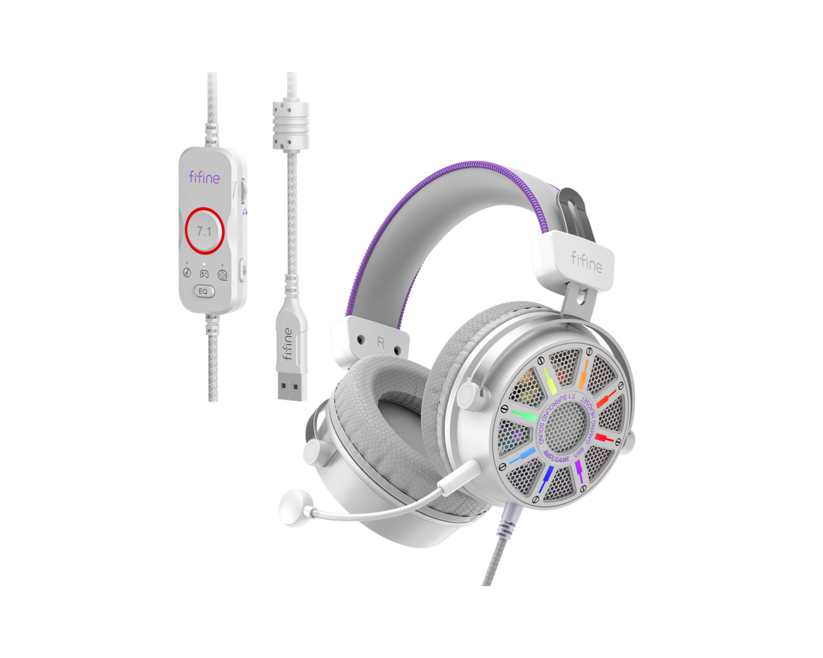 H19 är ett gaming headset från Fifine, utformat för att ge en överlägsen ljudupplevelse under spelande och streaming. Headsetet levererar 7.1 virtuell surroundljud vilket ger en detaljerad ljudbild och låter gamers höra exakt varifrån ljudet kommer. Utrustad med ett avtagbart mikrofon, gör den kommunikationen under spelets gång både klar och tydlig. H19:s byggkvalitet är av högsta standard, med mjuka öronkuddar som är designade för att ge bekvämt stöd under långvariga spelsessioner.RGB-belysningen går att anpassa, vilket ger gamers möjlighet att skräddarsy sitt headset för att matcha den restande utrustningen. Med olika EQ-lägen kan du även justera ljudprofilen baserat på vilket spel du spelar, vilket ger en ytterligare nivå av anpassning för att optimera ljudupplevelsen. Huvudbandet är justerbart vilket säkerställer en perfekt passform för olika huvudstorlekar och ger hög ergonomi under användning.