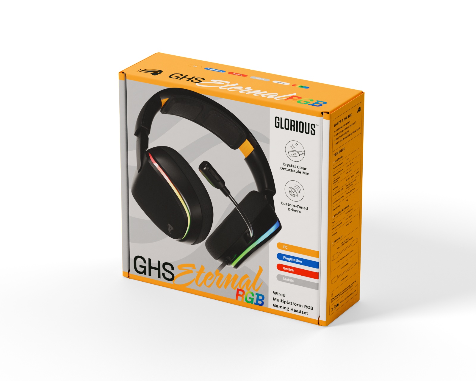 Glorious GHS Eternal RGB är ett trådat gamingheadset från Glorious, designat för att leverera högkvalitativ ljudupplevelse och komfort under långa spelsessioner. Det har skräddarsydda vinklade drivrutiner för att ge en balanserad ljudbild och ett avtagbart mikrofon som säkerställer klar kommunikation. Det ansluts via USB-C och 3,5 mm kontakt och är kompatibelt med flera plattformar inklusive PC och Xbox.Byggkvaliteten på GHS Eternal RGB är hög, med förstärkta material som skyddar mot intensiv användning och ger extra hållbarhet. Headsetet har öronkuddar i minnesskum och justerbara öronkåpor vilket bidrar till komforten under längre användning. Den inbyggda volymkontrollen och mute-knappen är lättåtkomliga och gör justeringar under spelandet smidiga. RGB-belysningen kan anpassas genom Glorious CORE-programvaran, vilket ger möjlighet att matcha headsetet med din spelsetup.
