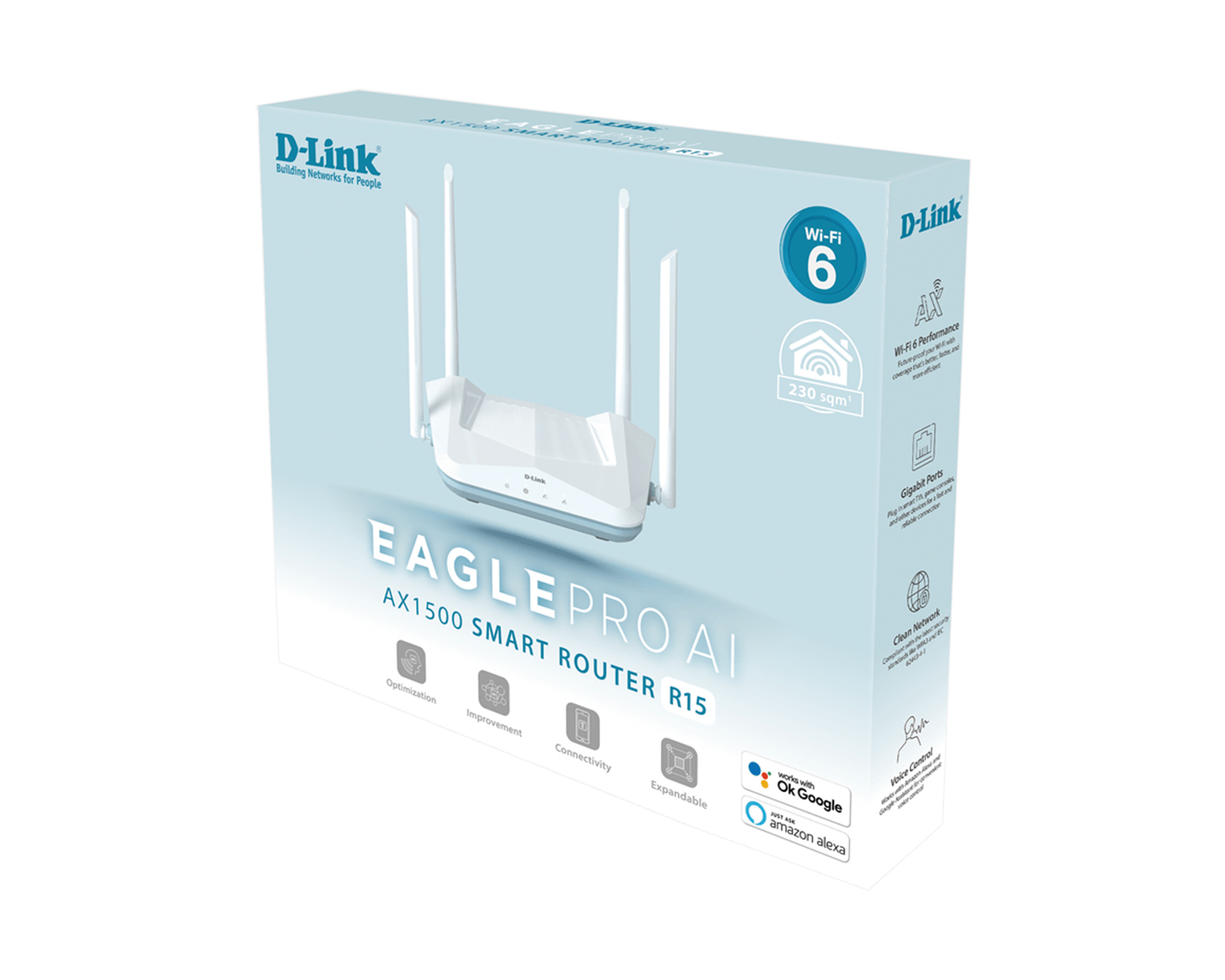 EAGLE PRO AI AX1500 Smart Router är en router från D-Link som erbjuder avancerad Wi-Fi-teknik med stöd för Wi-Fi 6. Denna router har en sammanlagd datahastighet på 1500 Mb/s, fördelad mellan 1201 Mb/s på 5 GHz och 300 Mb/s på 2.4 GHz. Produkten är designad för att stödja flera enheter samtidigt, vilket gör den lämpad för smarta hem där flera användare kan streama, spela eller arbeta utan avbrott. Routern hanteras enkelt via EAGLE PRO AI-appen och innehåller avancerade säkerhetsfunktioner som WPA3.EAGLE PRO AI AX1500 är utrustad med dual-band-teknik, vilket möjliggör en optimerad nätverksupplevelse. Med funktioner som MU-MIMO och OFDMA kan enheten effektivt hantera flera samtidiga anslutningar, vilket minimerar trafikstockningar. Röststyrning via Google och Alexa tillhandahålls också, vilket ger användarna ännu mer kontroll över sitt nätverk. Routern har AI-baserad Mesh-funktionalitet för att förbättra nätverksstäckning. Föräldrakontroll och trafikoptimering ingår för att ytterligare personalisera användarupplevelsen.