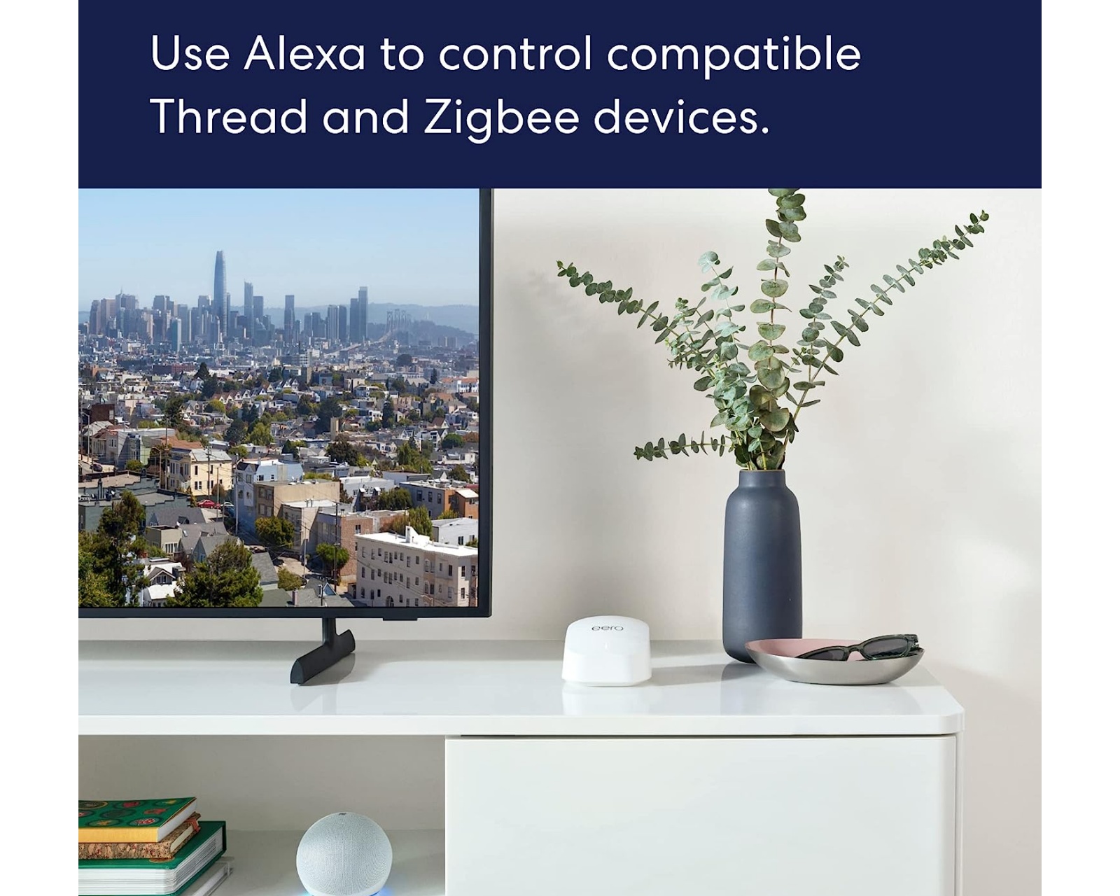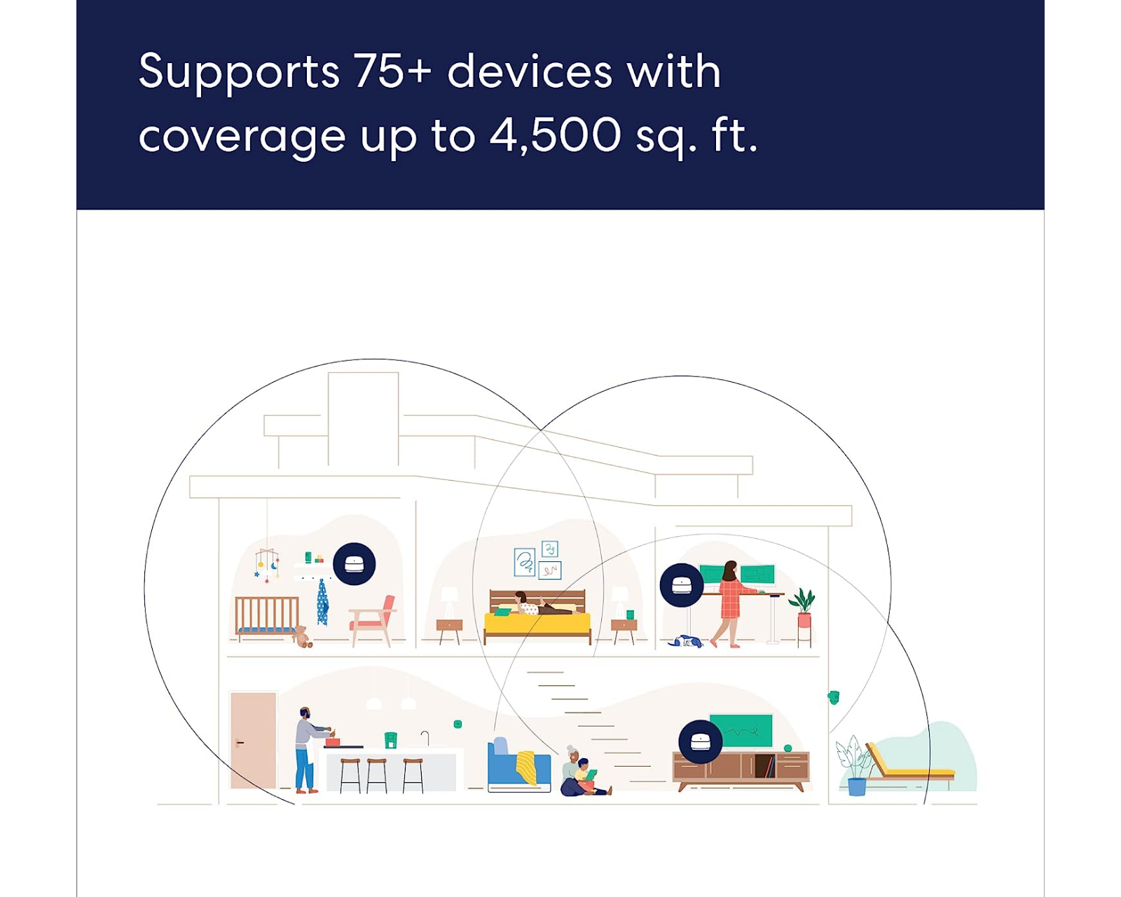 6+ AX3000 är ett dual-band Wi-Fi 6 mesh-system från Eero som erbjuder en pålitlig och snabb internetanslutning. Systemet ger hastigheter på upp till 1 Gbps och täcker ett område på upp till 420 m². Det är designat för att effektivt hantera flera enheter genom sitt avancerade mesh-nätverk, vilket säkerställer låg latens och stabil prestanda vid streaming och spelande.Mesh-systemet bygger på eero TrueMesh-teknik, där tre routrar samverkar för att optimera täckningen och göra det enklare att nå varje hörn av ditt hem. Med stöd för över 75 enheter per nod och två Gigabit Ethernet-portar på varje router kan du enkelt skapa en trådbunden anslutning för enheter som kräver extra stabilitet. eero 6+ har också inbyggt stöd för smarta hem-enheter via Thread och Zigbee samt integration med Alexa, vilket gör det till ett praktiskt val för det moderna hushållet.
