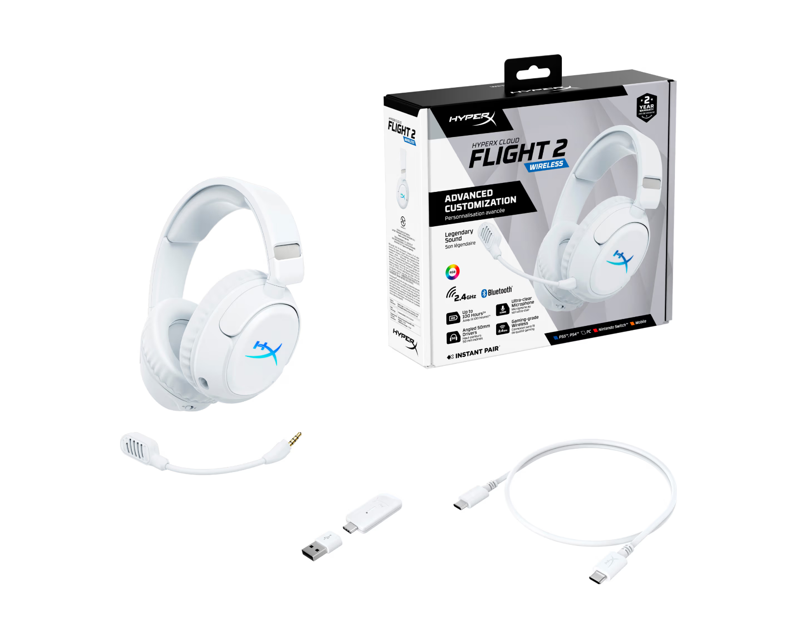 Cloud Flight 2 är ett trådlöst gamingheadset från HyperX, designat för att ge gamers en sömlös upplevelse med multiplattformskompatibilitet och dubbla anslutningslägen. Med kraftfulla 50 mm-element och en exceptionell batteritid på upp till 150 timmar, är detta headset optimerat för långvariga spelsessioner och erbjuder både klarhet och precision i ljudupplevelsen. Den dubbla mikrofonlösningen säkerställer tydlig kommunikation under spelande.Byggkvaliteten hos Cloud Flight 2 är utmärkt, med ett mjukt memoryskum och 90-graders roterande öronkåpor, vilket underlättar förvaring och komfort vid långvarig användning. Den dubbla trådlösa anslutningen via 2,4 GHz och Bluetooth 5.3 ger flexibilitet i anslutningar och låg latens. RGB-belysning och magnetiska utbytbara plattor gör att headsetet kan anpassas för personlig stil, medan HyperX NGENUITY-programvaran erbjuder ytterligare möjligheter att justera belysning och ljudinställningar.