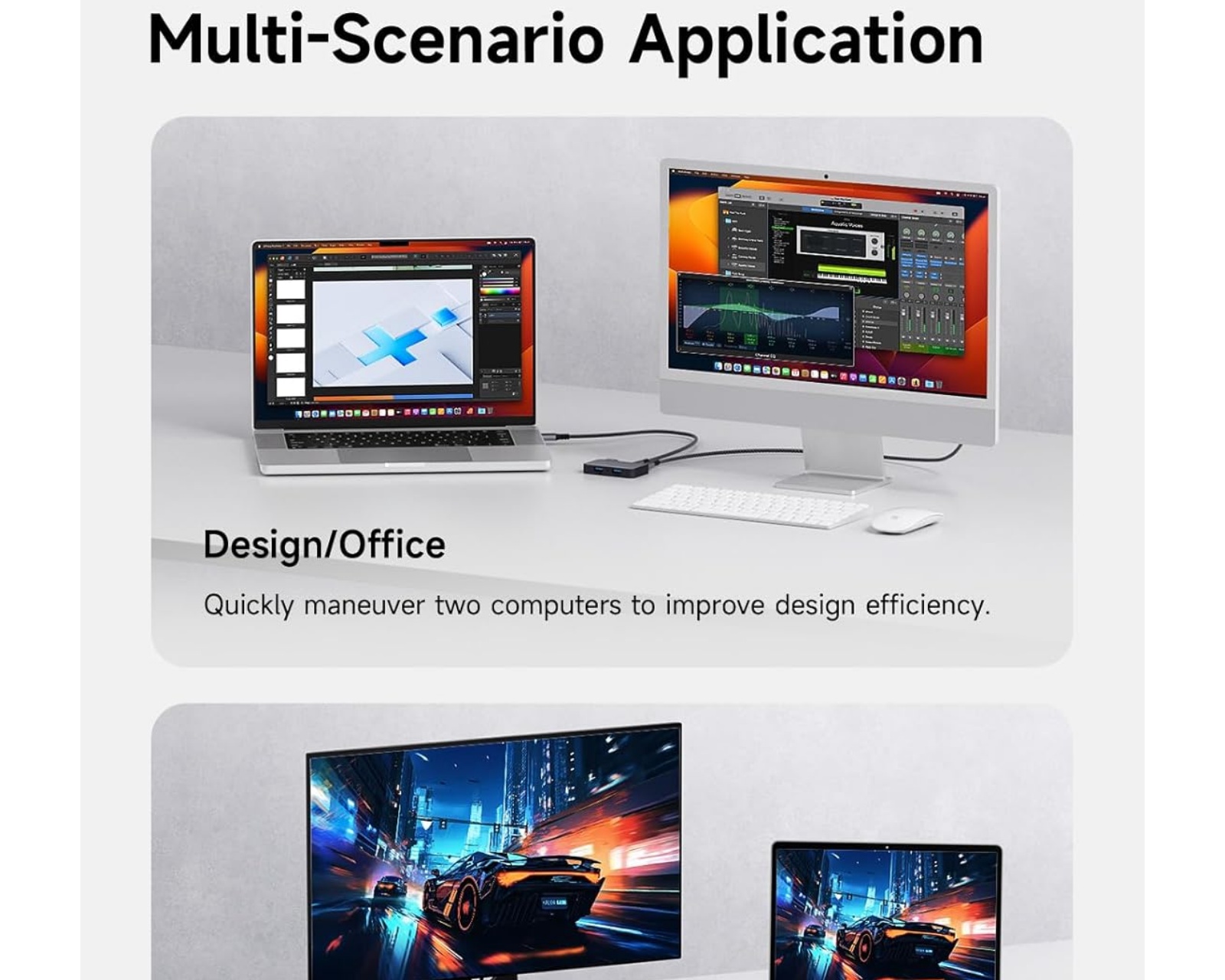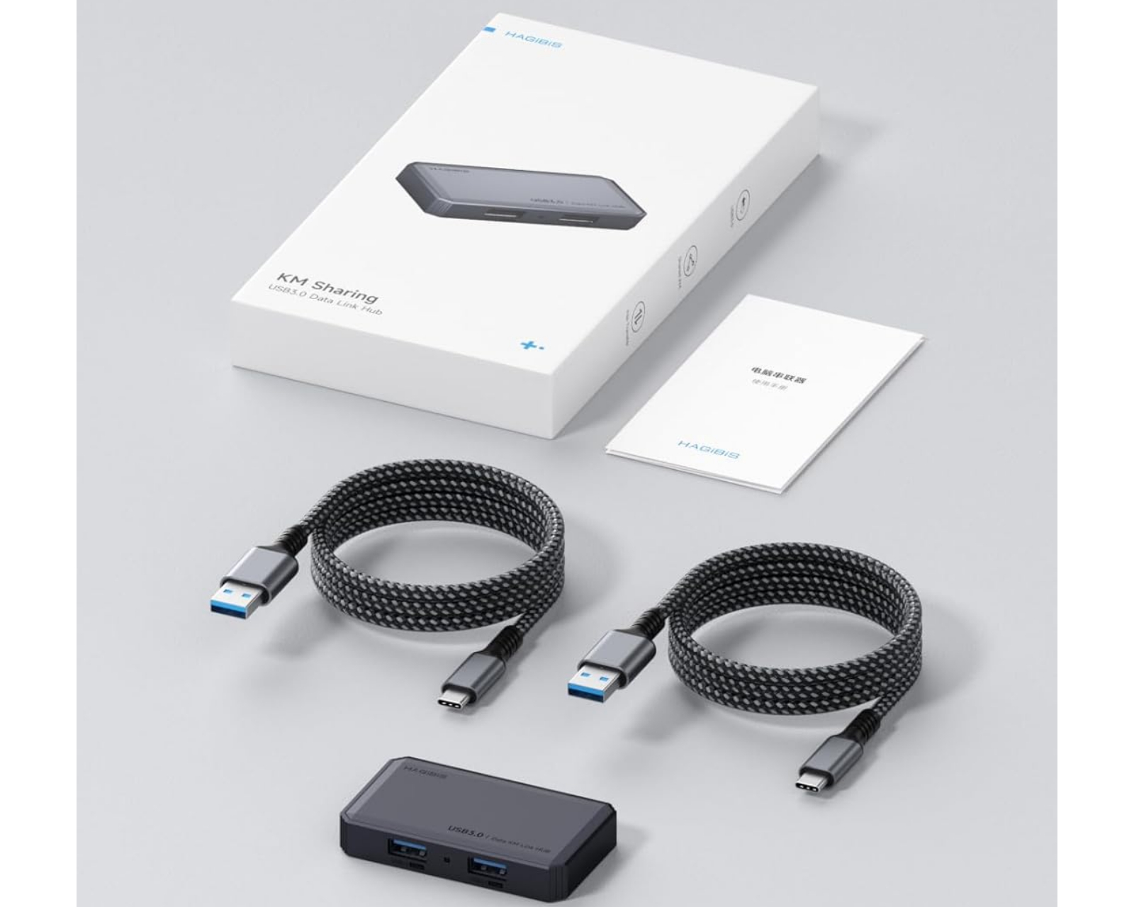 Hagibis USB Switch är en dataliknande hub från Hagibis som möjliggör delning av USB-enheter mellan två datorer. Den stöder upp till fyra USB-enheter, inklusive tangentbord, mus, skrivare och USB-kameror. Med en överföringshastighet på upp till 5 Gbps är den lämplig för både Windows och macOS-laptops, vilket ökar arbetsproduktiviteten.Enheten saknar knappar för funktioner, vilket innebär att användaren kan växla mellan datorerna genom att endast röra musen från en dator till en annan. De anslutna USB-enheterna växlar automatiskt enligt denna rörelse, vilket ger en smidig och effektiv arbetsmiljö. Hubben innehåller två USB 3.0 A till C-kablar för att ansluta en mängd olika USB-enheter. Med denna koppling är det möjligt att ansluta en USB C-hub för att utöka antalet portalternativ för båda datorerna.