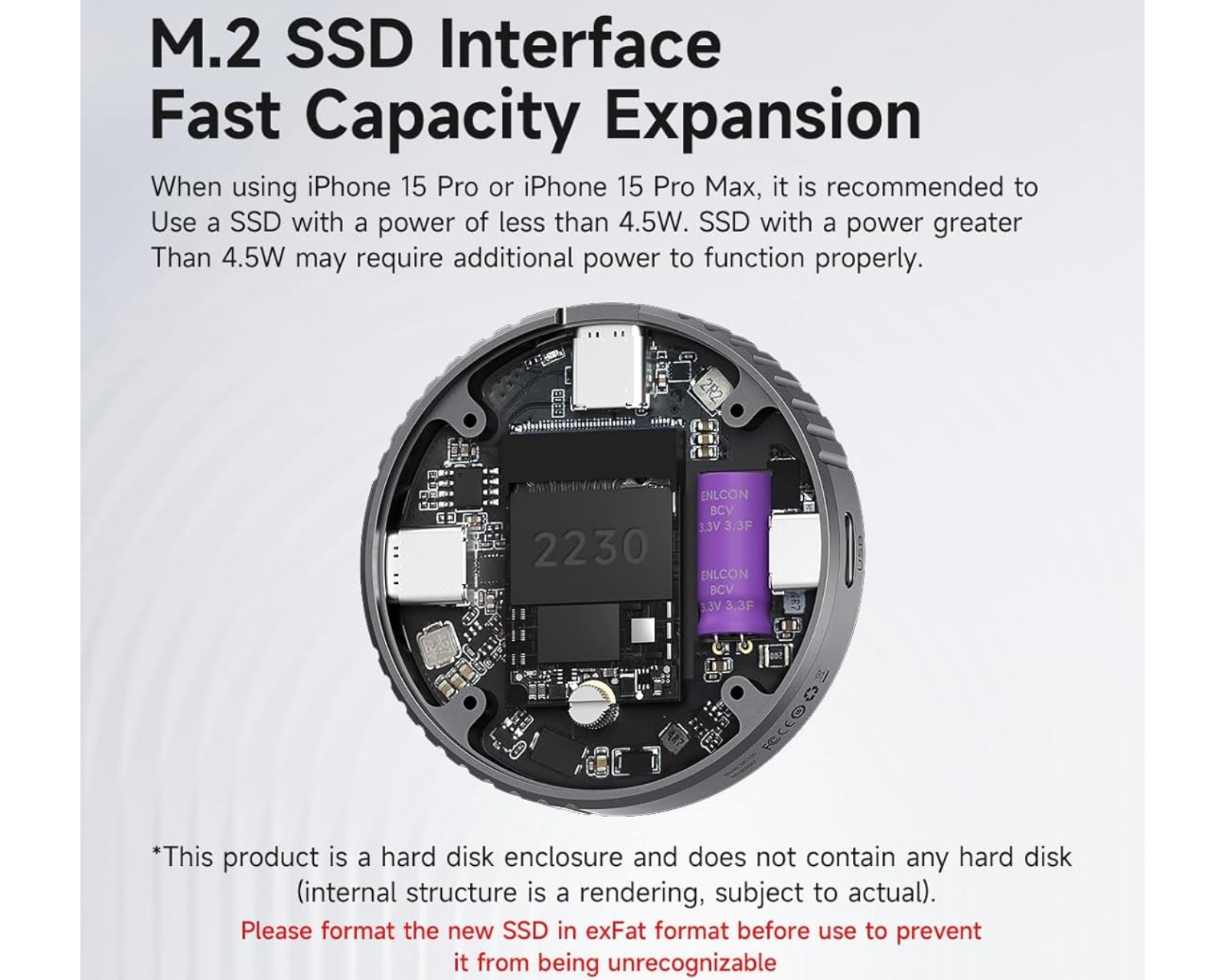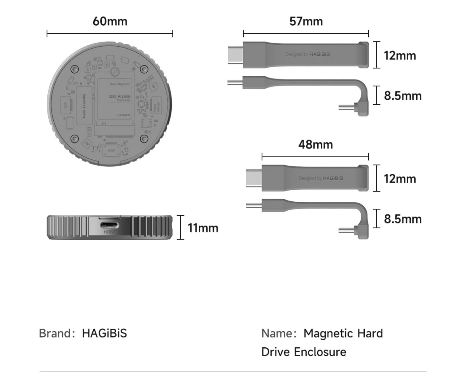 Hagibis M.2 2230 NVMe SSD-hårddiskkabinett är en aluminiumkonstruktion som erbjuder skydd och funktionalitet för NVMe SSD-enheter i formatet 2230. Det är specifikt designat för att stödja enheter med M-Key och B+M-key, och ger en överföringshastighet på upp till 10 Gbps med USB 3.2 Gen2. Detta hårddiskkabinett har en integrerad magnetisk struktur som ger en säker anslutning med MagSafe, vilket stabilt fäster det vid kompatibla enheter. Det är avsett för användning med bland annat iPhone 15 Pro/Pro Max och andra enheter med USB Type-C-portar.Hårddiskkabinettet är tillverkat av aluminium, vilket ger god hållbarhet och värmeavledning för att optimera prestanda under användning. Utöver det erbjuder den dubbelt skydd mot strömavbrott med en superkondensator och en huvudkontroll, vilket förlänger skyddet av data under strömavbrott. Utrustat med två USB Type-C-kablar för datatransfer, är det kompatibelt med andra enheter, inklusive MacBook och Android-telofoner. Den stöder upp till 2 TB kapacitet och erbjuder plug-and-play-användning utan komplicerad installation.