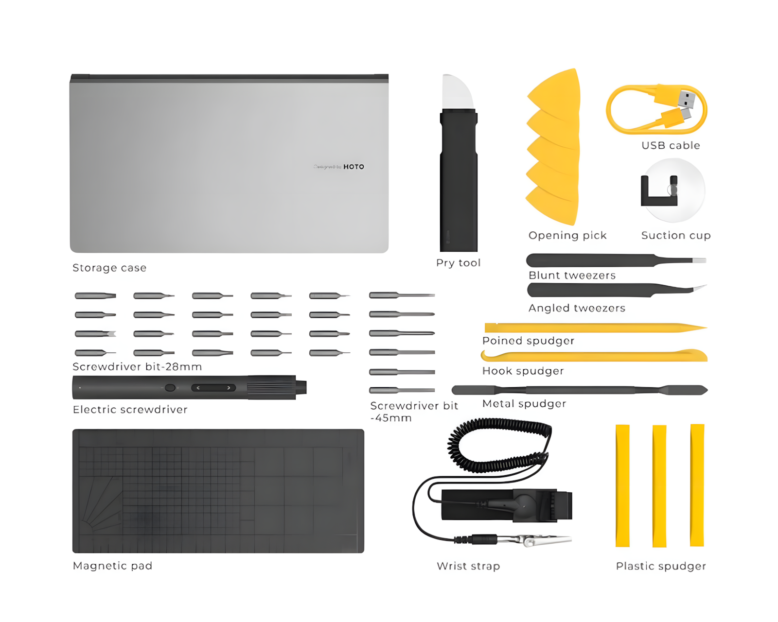 Precision Skruvmejselkit Pro är en elektrisk skruvmejsel från HOTO som kombinerar precision och praktisk funktionalitet. Den är utrustad med en dual torque-funktion vilket gör det enkelt att växla mellan känsliga och krävande uppgifter. Med en knapplösning för enkel aktivering och LED-belysning för att lysa upp arbetsområdet, erbjuder detta kit användarvänlighet och effektivitet. Den finns även med snabb magnetisk bit-byte för smidig hantering.Kit består av 48 högkvalitativa tillbehör som möjliggör ett brett spektrum av användningsområden, från små elektroniska apparater till hemreparationer. Hela setet förvaras i en klamshell-arbetsstation som håller allt organiserat och lättillgängligt. Byggkvaliteten är hög med starka materialval som säkerställer hållbarhet. Den elektriska skruvmejseln visar på pålitlig prestanda, vilket gör den lämplig för både professionella och gör-det-själv-entusiaster som värdesätter effektivitet och noggrannhet.