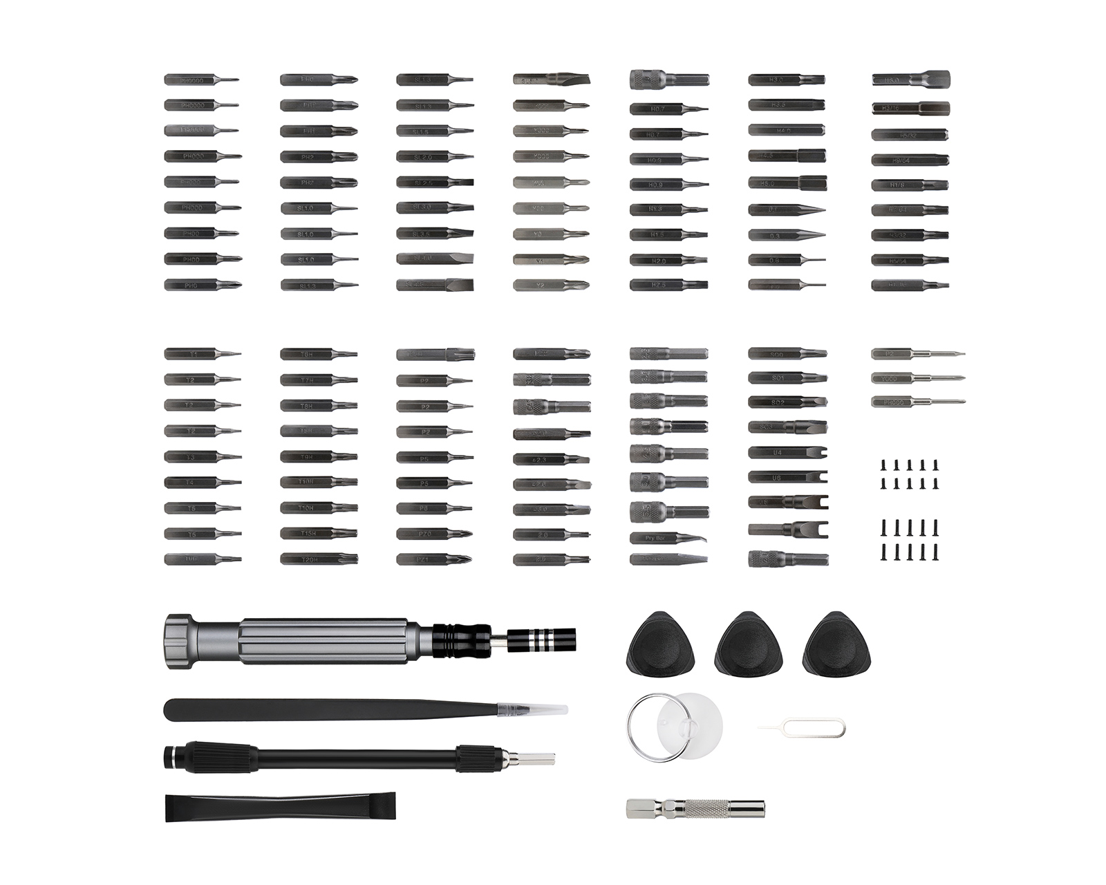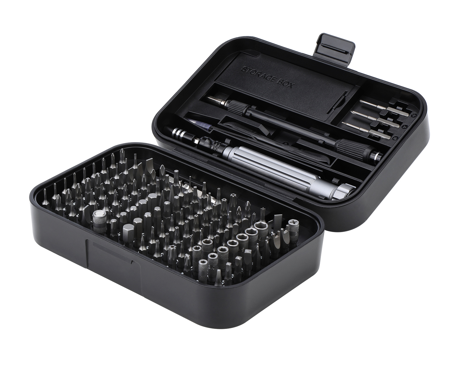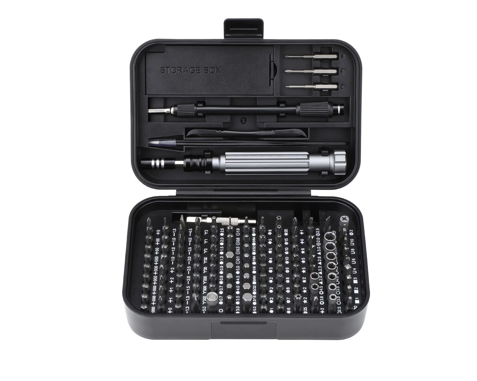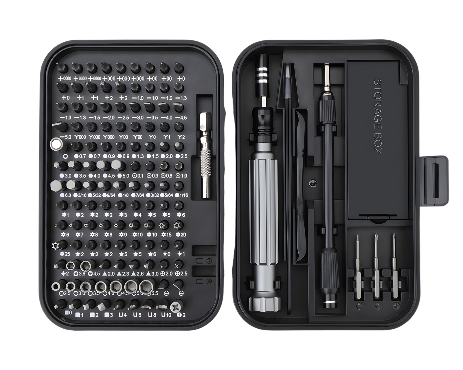 Verktygssats och skruvmejselset från MaxMount, designat för både hobbyister och professionella användare inom data- och teknikområdet. Med hela 117 olika skruvbits och ett urval av reparationsverktyg erbjuder denna sats en komplett lösning för att hantera olika uppgifter, från datorunderhåll till reparation av smartphones. Verktygssatsen är kompakt och lätt, vilket gör den perfekt för användning hemma eller on-the-go.Den bärbara förvaringslådan är tillverkad av ett hållbart, stötsäkert material som skyddar innehållet och ger långvarig hållbarhet. Den ergonomiska designen med ett bekvämt handtag underlättar transporten. Lådans insida är intelligent konstruerad med tydligt märkta fack för varje skruvbit och verktyg, vilket ger snabb och enkel åtkomst under arbete. Dessutom har den en magnetisk yta som säkerställer att skruvar och smådelar hålls på plats, vilket minimerar risken för att något tappas bort.